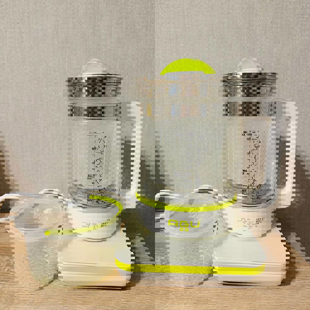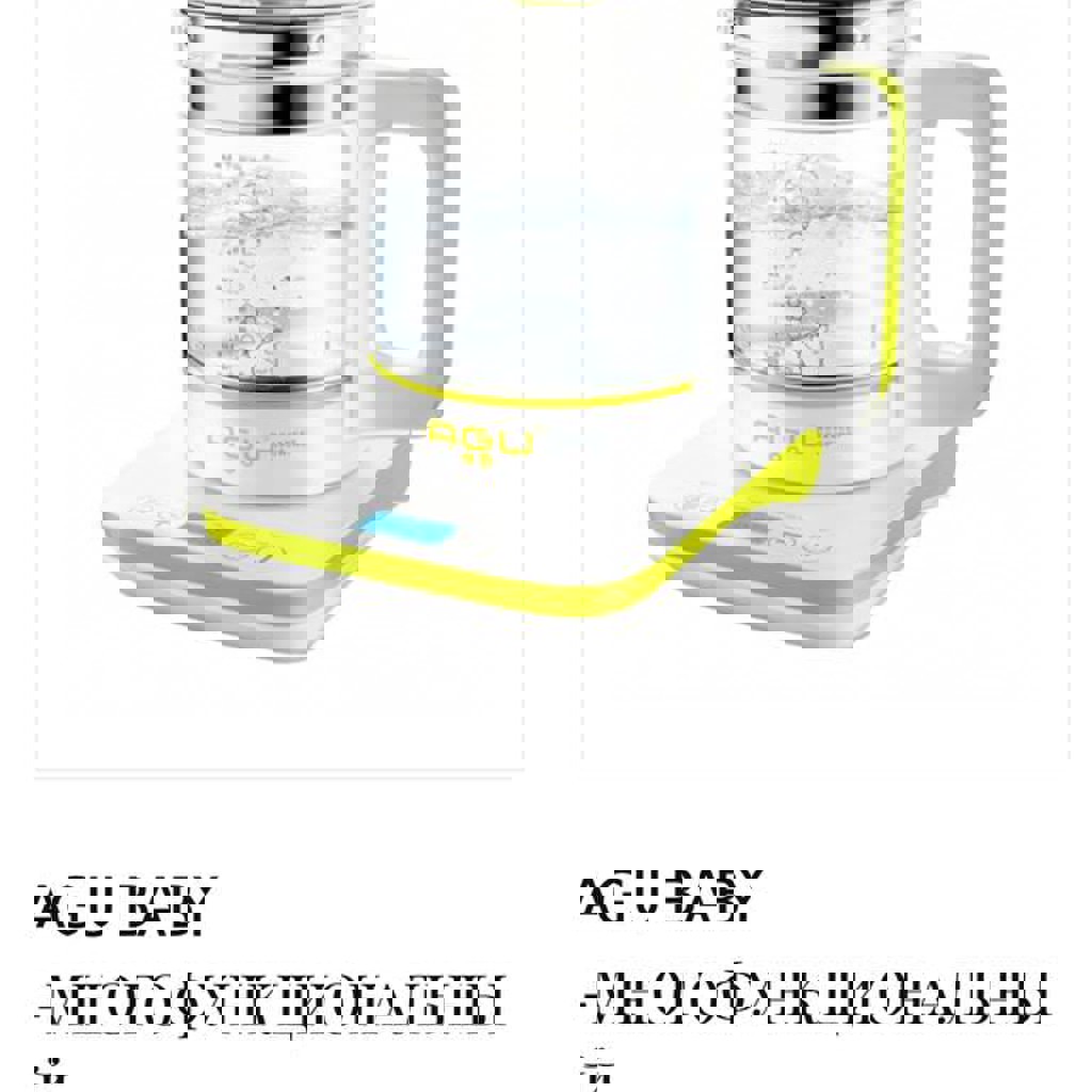 Многофункциональный электрический чайник с 6 функциями в 1. Многофункциональный чайник AGU Baby экономит время и силы родителей, сочетая в себе все необходимые функции для приготовления детского питания. Чайник включает в себя 6 различных функций: • Кипятит воду для адаптированной смеси и поддерживает заданную температуру после остывания • Имеет функцию приготовления на пару, которую можно использовать для приготовления как овощей, так и мяса (говядины, птицы, рыбы) • Имеет функцию стерилизации. Оснащен специальной высокой крышкой для стерилизации больших бутылочек • Можно нагревать как воду, так и готовое питание до заданной температуры • Можно задать нужное время автоматического включения • Поддерживает заданную температуру воды в течение 24 часов. (Возможно приготовление сметаны и йогурта)