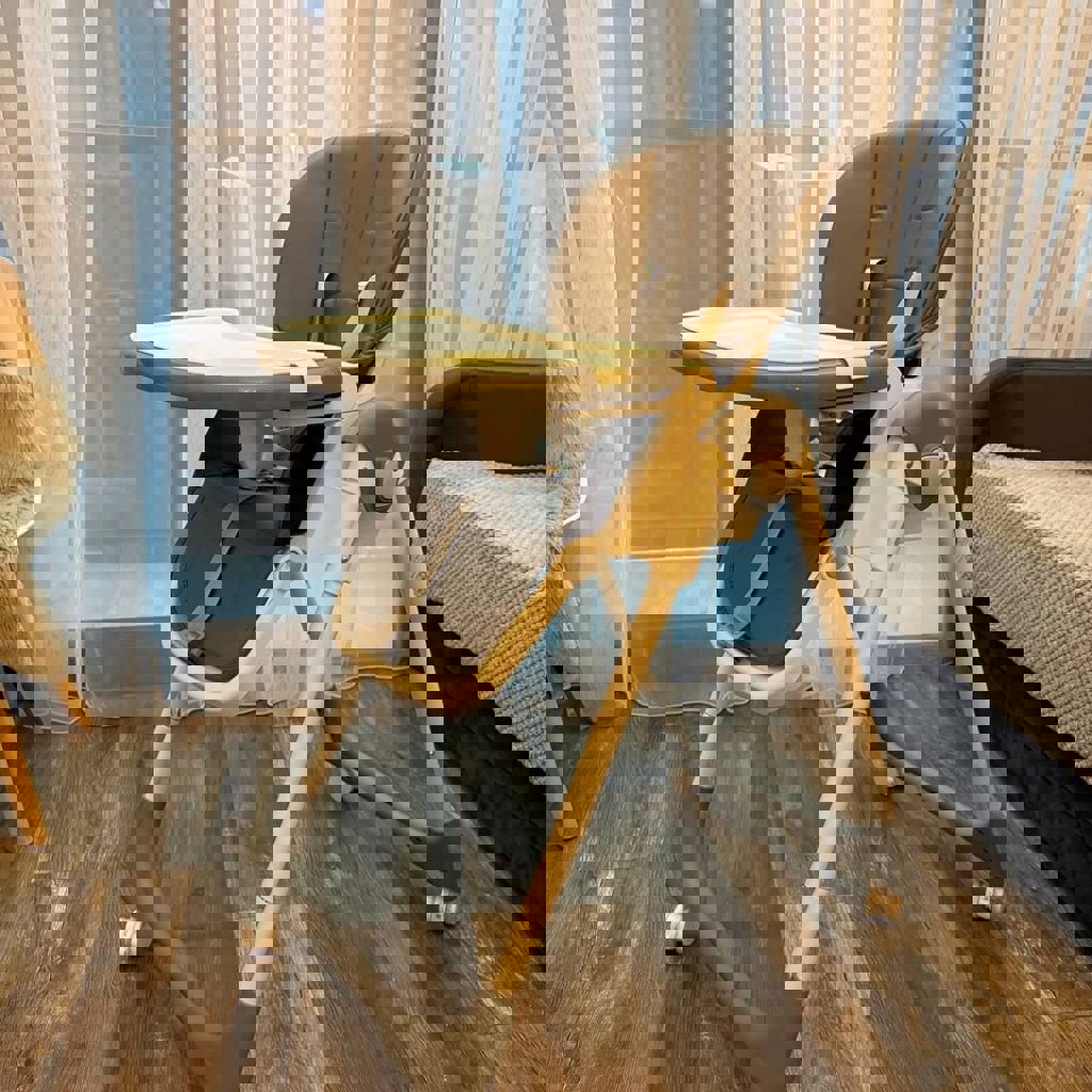 Спинка регулируется, откидывается. Высота и подножка регулируются. Поднос снимается, удобно мыть.