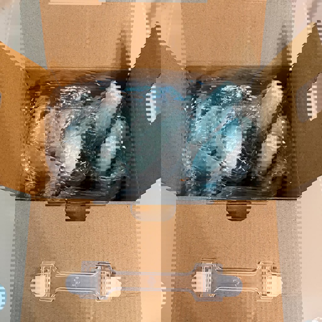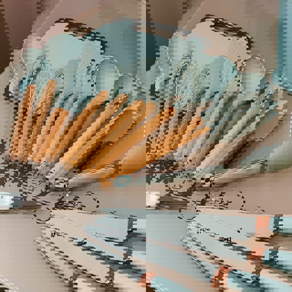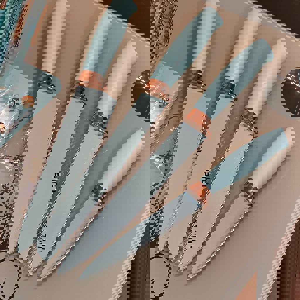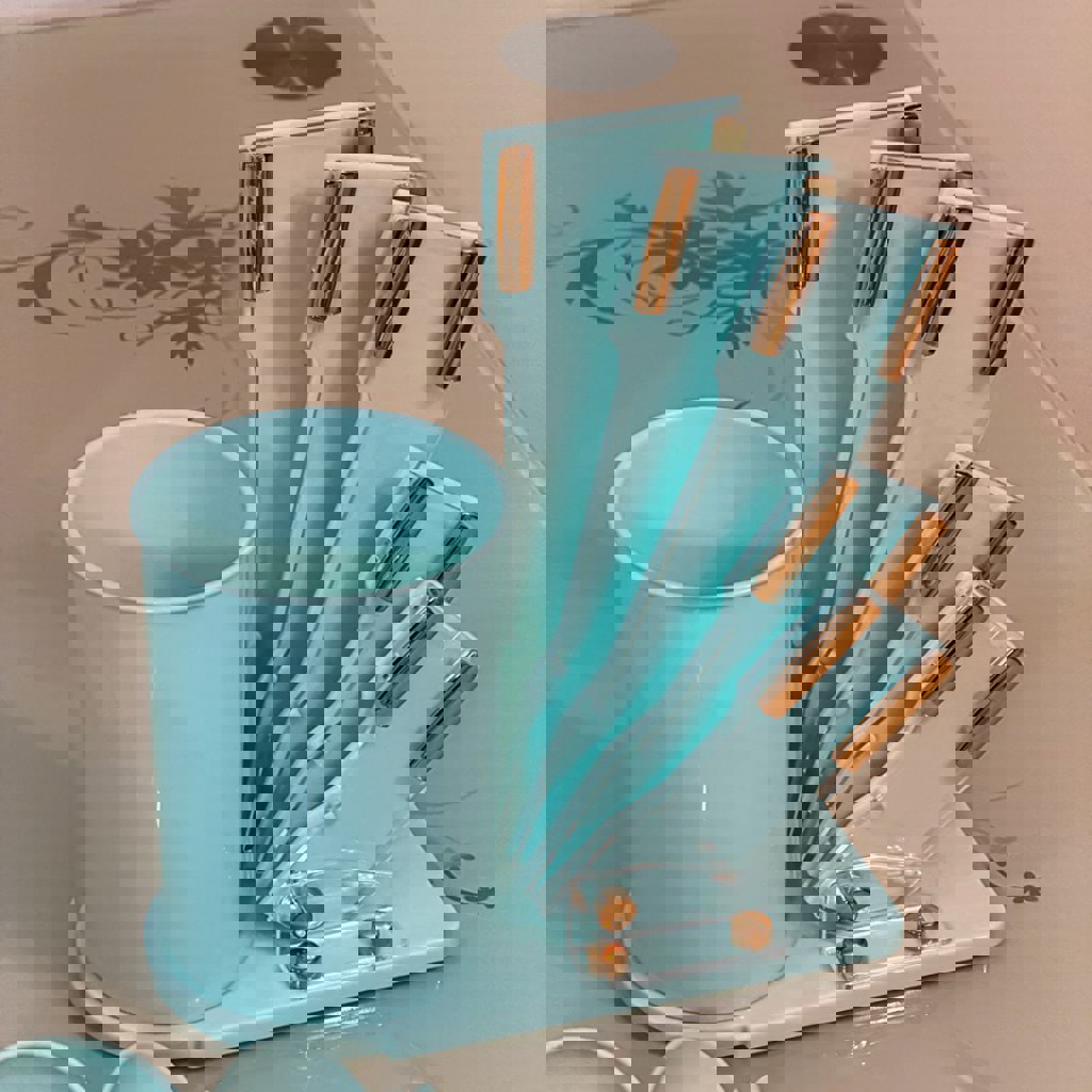 Полный комплект. Силиконовые аксессуары, удобная подставка, острые ножи, цвет тиффани. Подойдёт для ежедневного использования или в подарок. Новый, в коробке.
