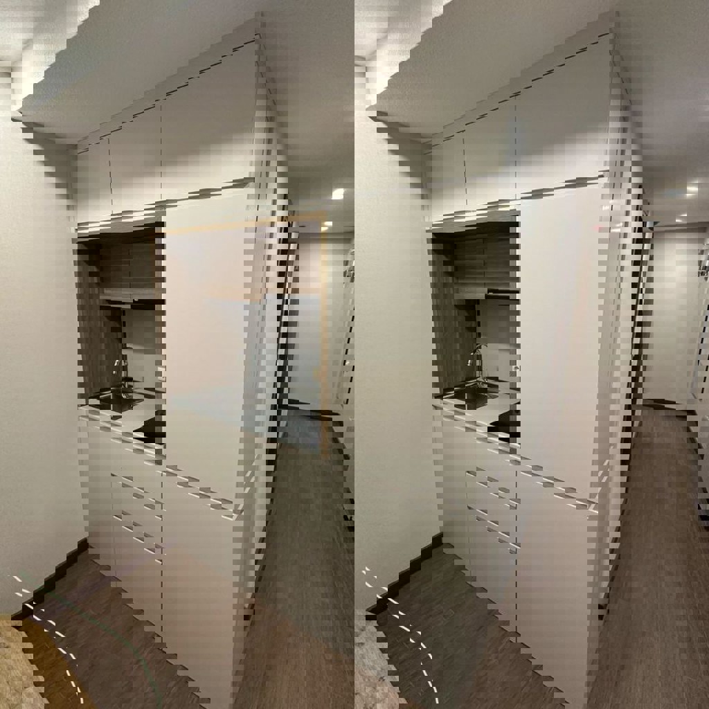 Кухня с фасадами из турецкого ламината ORMA 18 мм, корпус из турецкого ламината ORMA 18 мм, фурнитура польская GTV, ручка фасад уменьшен на 30 мм, срез 45° (обработанный и закромлённый), столешница из турецкого ламината 28 мм, мойка из нержавеющей стали, электрическая варочная панель на 2 конфорки, встраиваемая вытяжка.