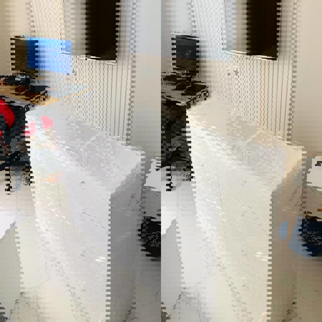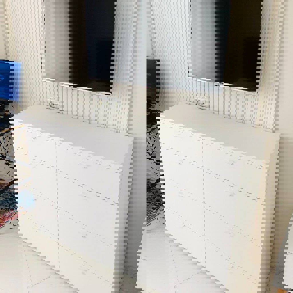 Белый комод отличного качества из jysk. Состояние нового!!, был в использовании всего 3 мес. 8 ящиков С ДОВОДЧИКАМИ. Плавное открывание. Не тонкий лдсп, а действительно качественный плотный материал приятный на ощупь.