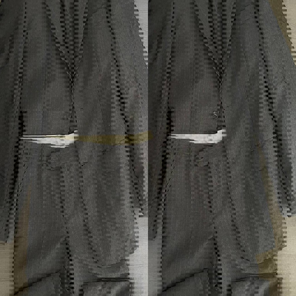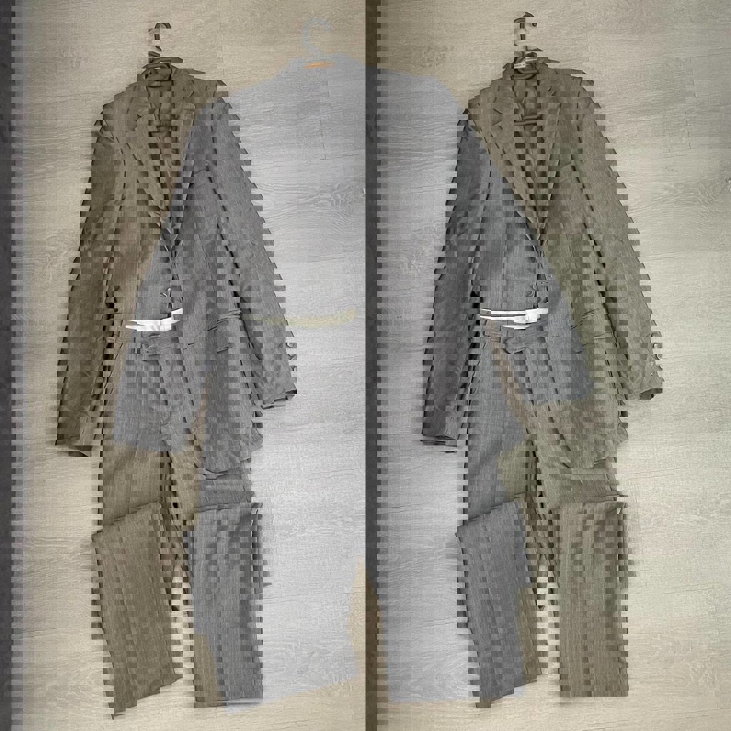 Костюм двойка (брюки и пиджак). Размер S. Длинна брюк - 100 см. Длинна рукова - 62 см. Материал: 25% шерсть, 15% вискоза, 60% ПЭ.