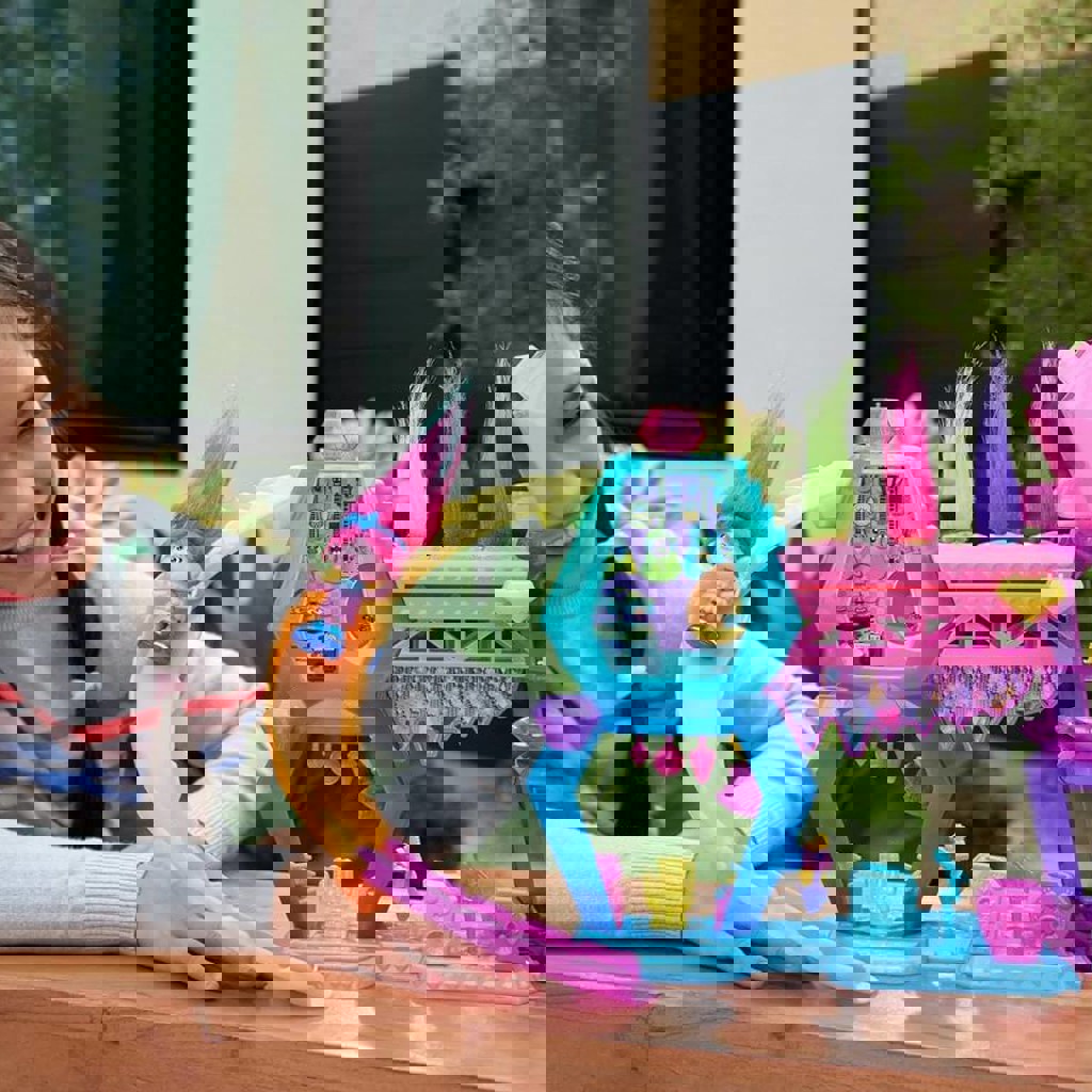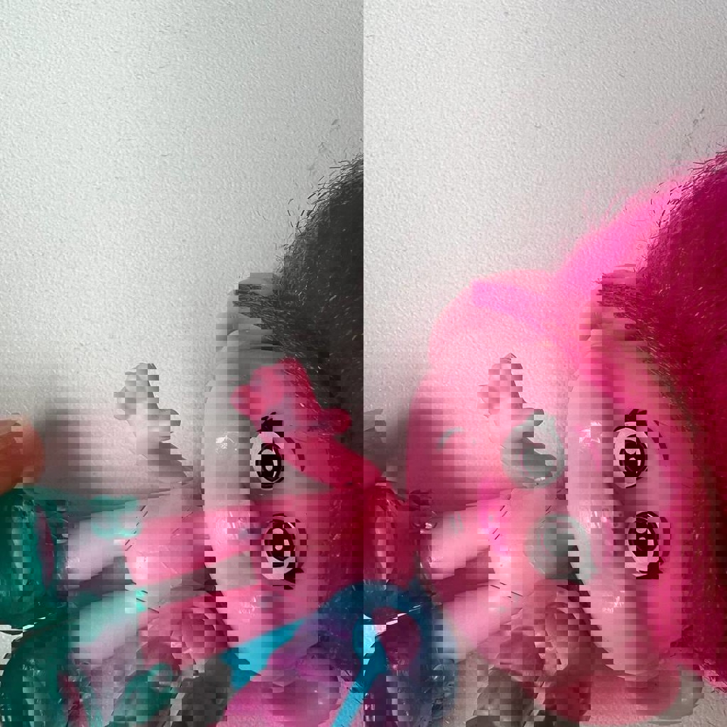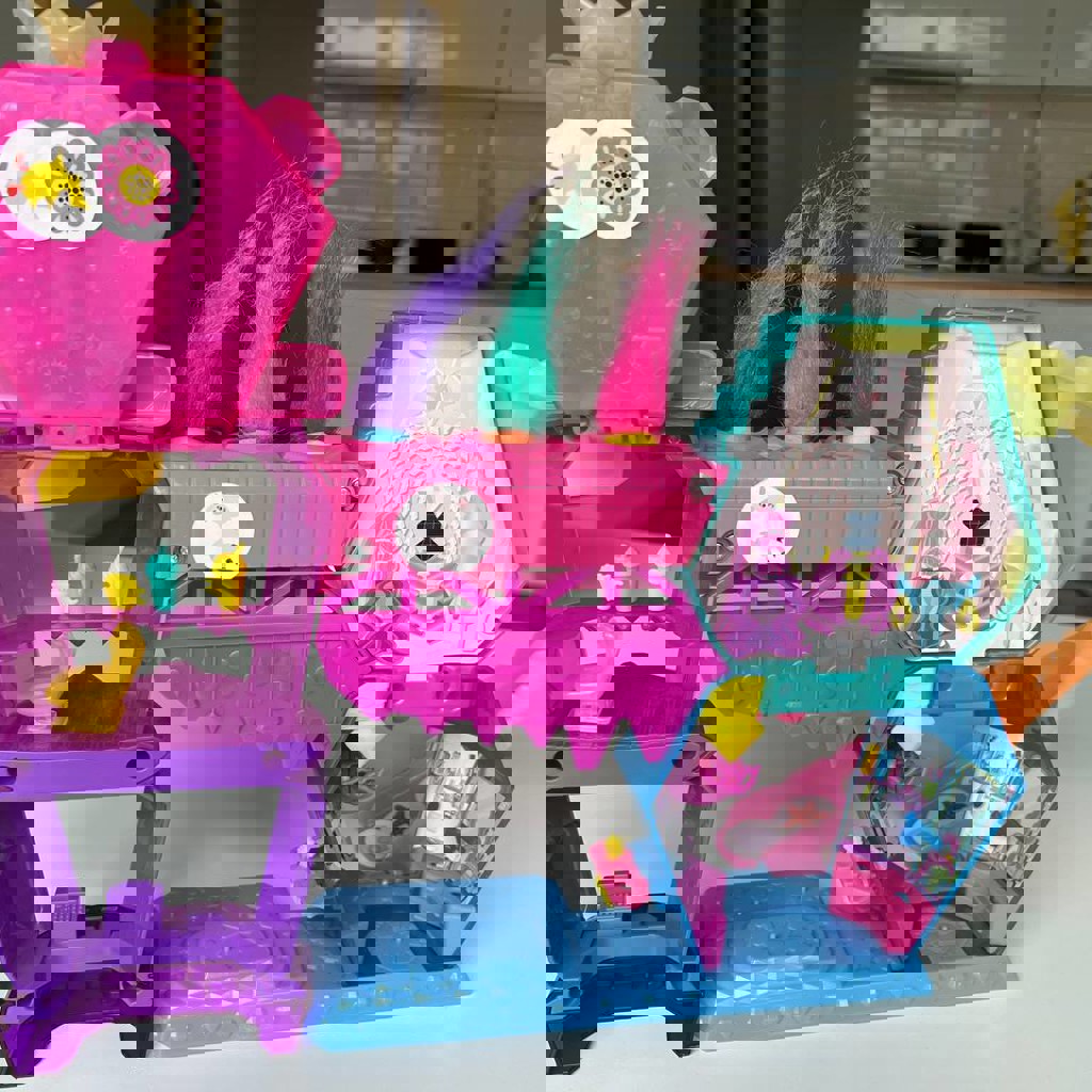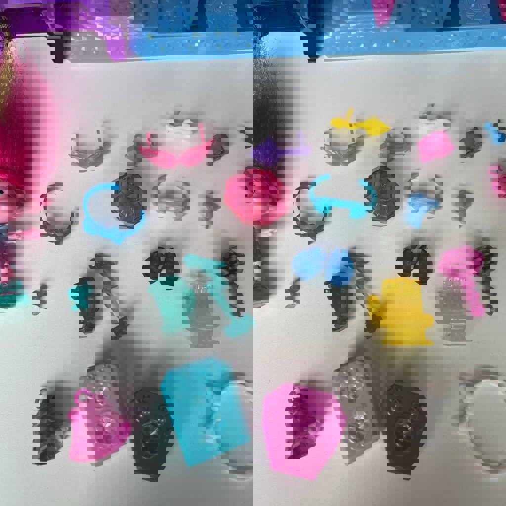 Полный комплект (сцена, горка, музыкальные инструменты, гримерка с цацками, нарядами, и возможностью менять волосы и делать прически, головы с волосами помещаются в ячейки и выпрыгивают, так же все детали компактно умещаются в голове медведя). Из нюансов: на теле фигурки трещина, на функционал не влияет, руки/ноги подвижны, не вываливаются; 'Украшено' наклейками, при желании можно их убрать.