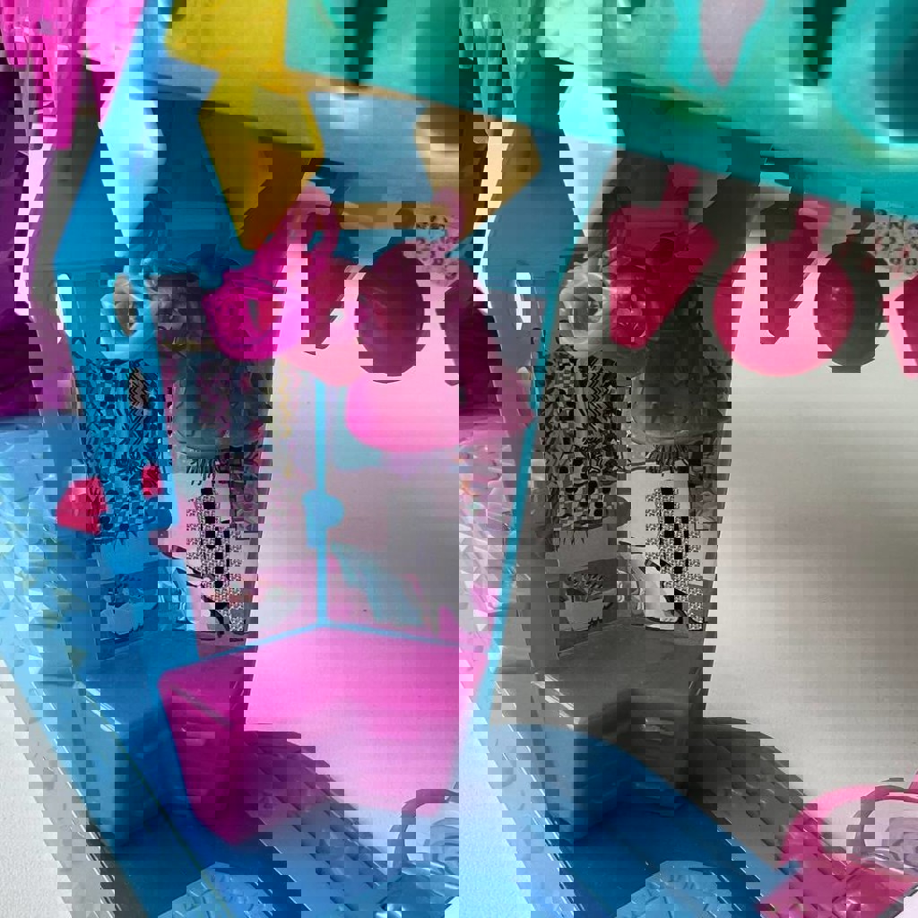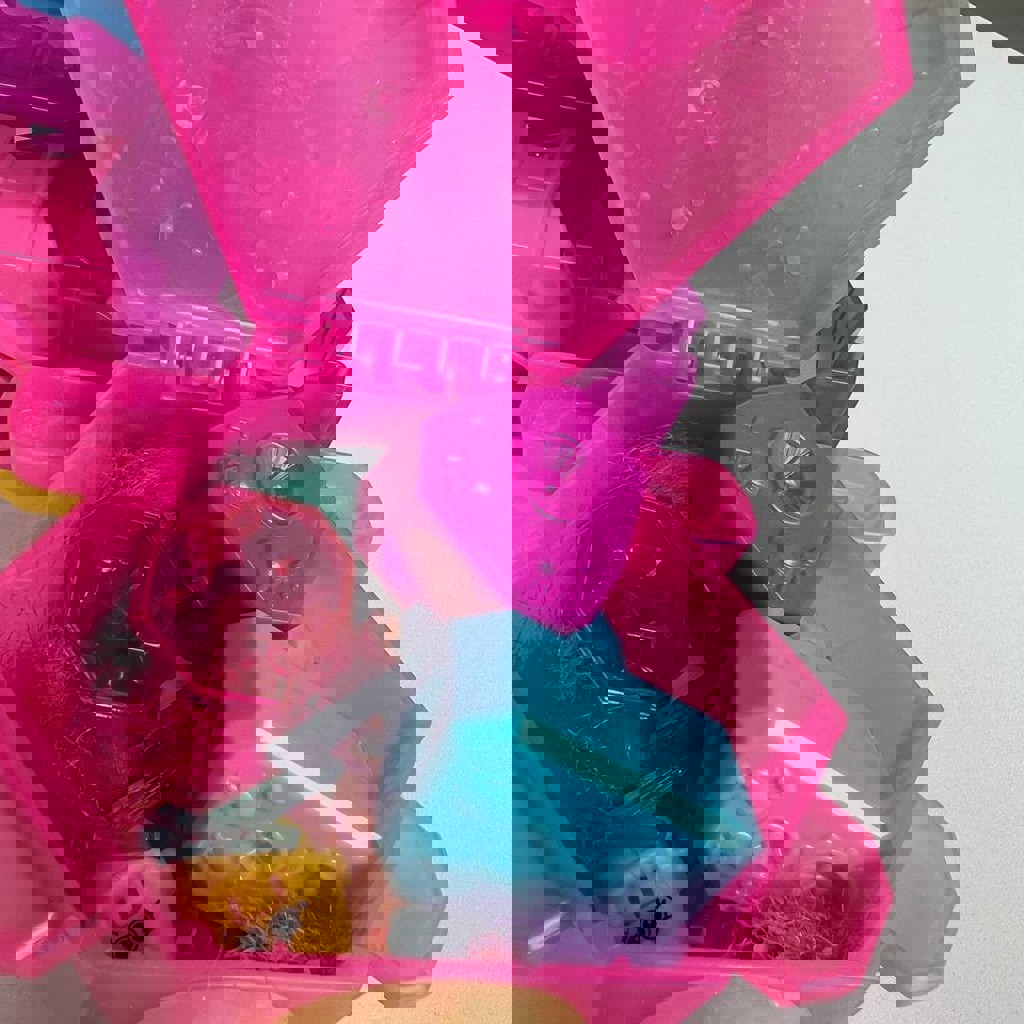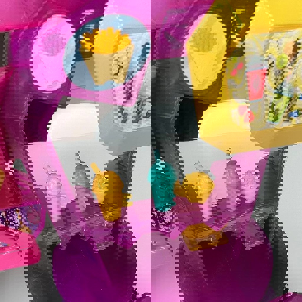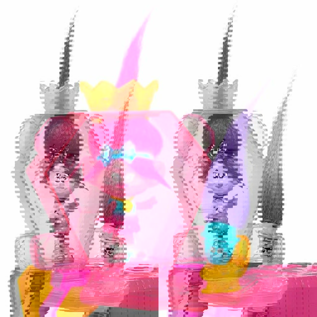 Полный комплект (сцена, горка, музыкальные инструменты, гримерка с цацками, нарядами, и возможностью менять волосы и делать прически, головы с волосами помещаются в ячейки и выпрыгивают, так же все детали компактно умещаются в голове медведя). Из нюансов: на теле фигурки трещина, на функционал не влияет, руки/ноги подвижны, не вываливаются; 'Украшено' наклейками, при желании можно их убрать.