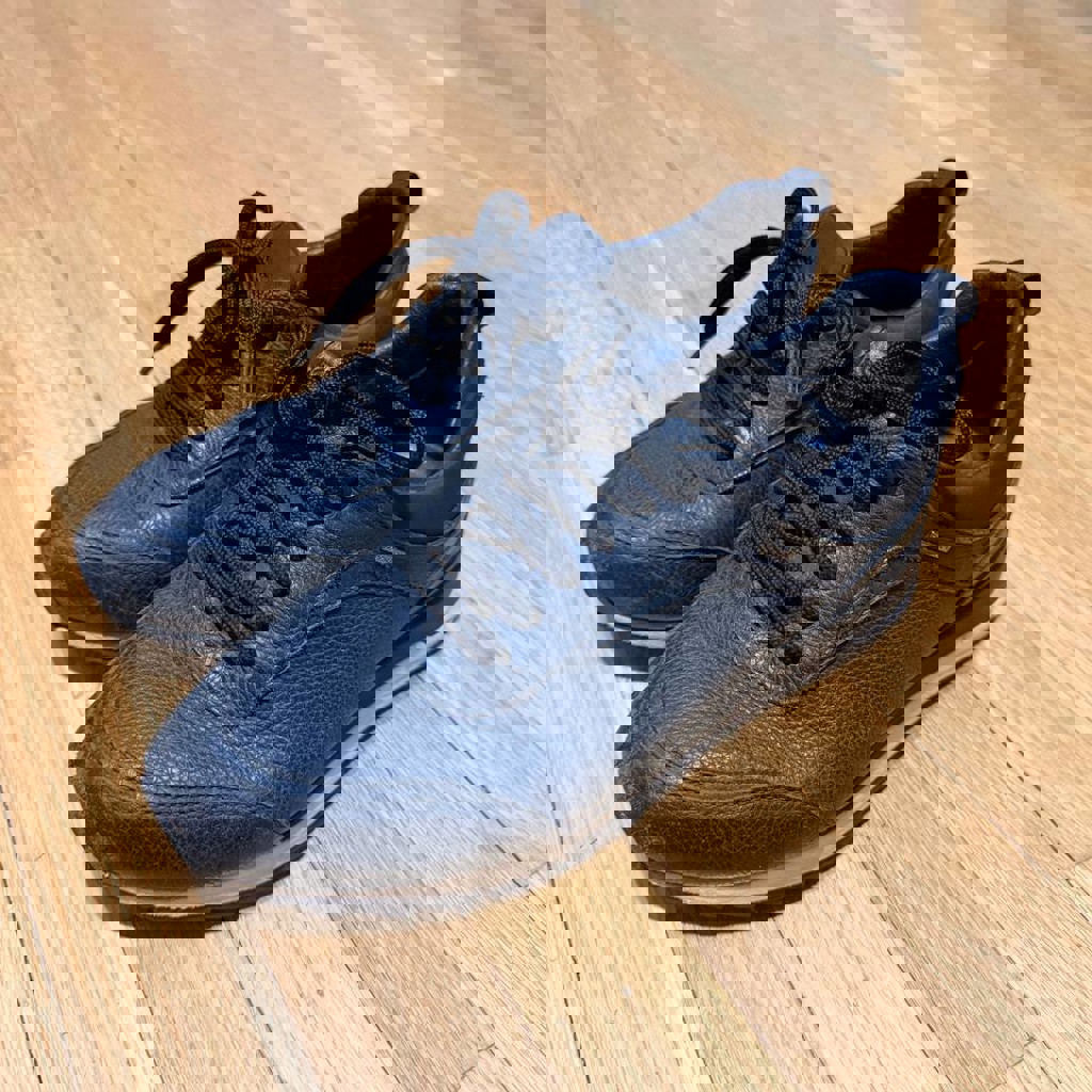 Толстая натуральная кожа. Есть следы носки в районе пальцев, можно замазать краской для обуви (у меня нет).