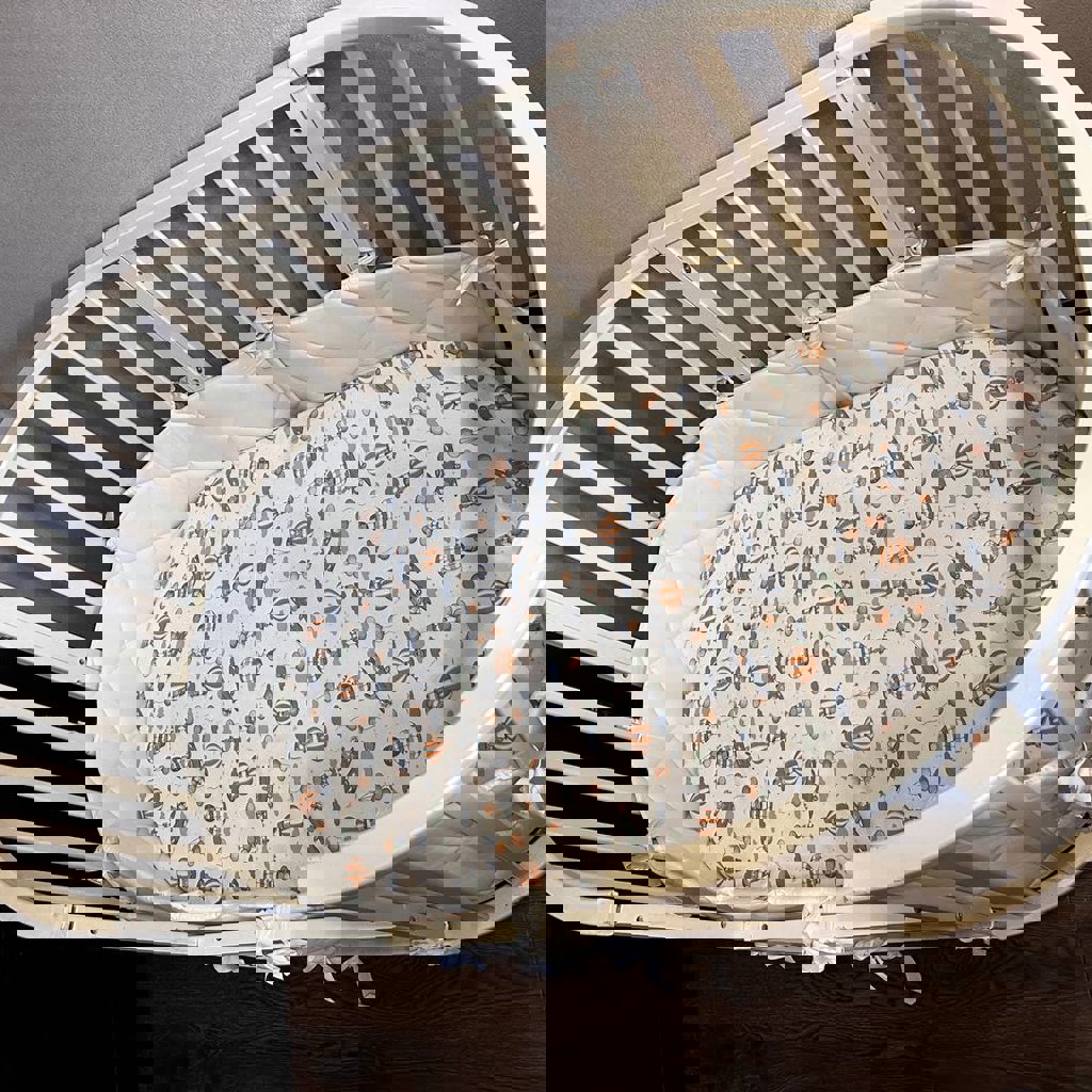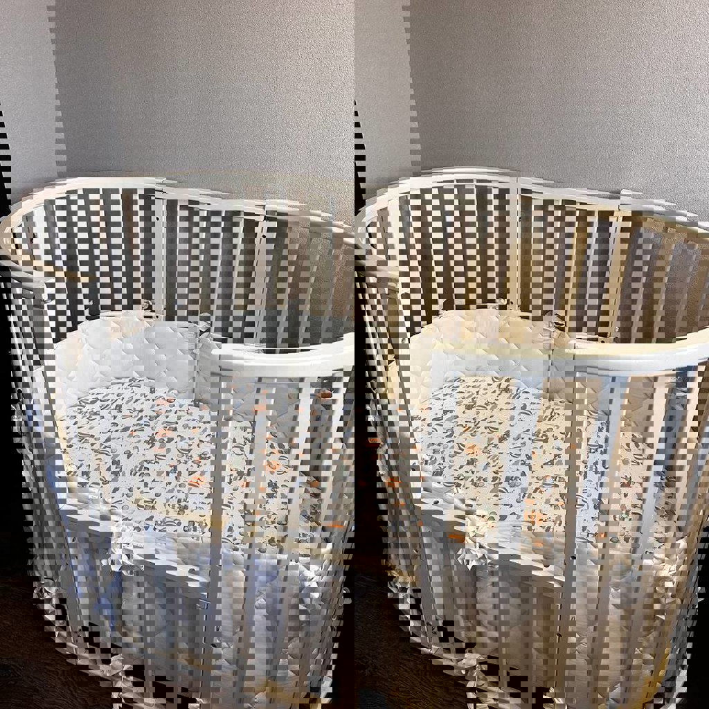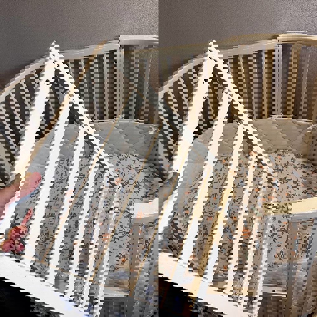 Кроватка трансформер детская, с матрасом, бортиками, 3 простыни на резинке (без пятен) + непромокаемый наматрасник. Если для совсем малышей, есть органайзер для подгузников, игрушек и тд, использовали с этой кроваткой.