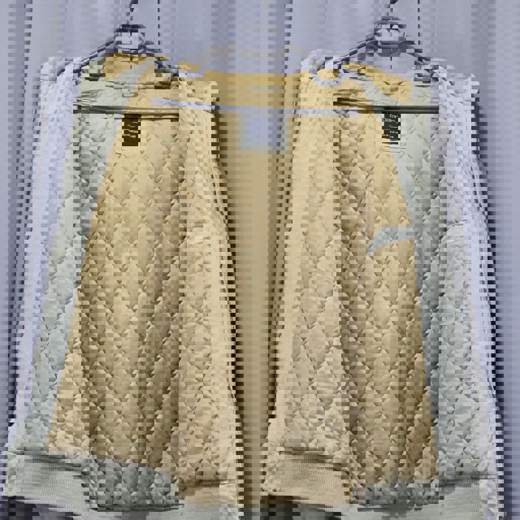 Тёплая и удобная, с мягкой подкладкой. Цвет — светло-бежевый / оливковый. Внутри стёганная подкладка золотистого оттенка. Плотная ткань, качественная молния. Идеальна для осени и мягкой зимы. Размер: M. Состояние отличное, носилась аккуратно.
