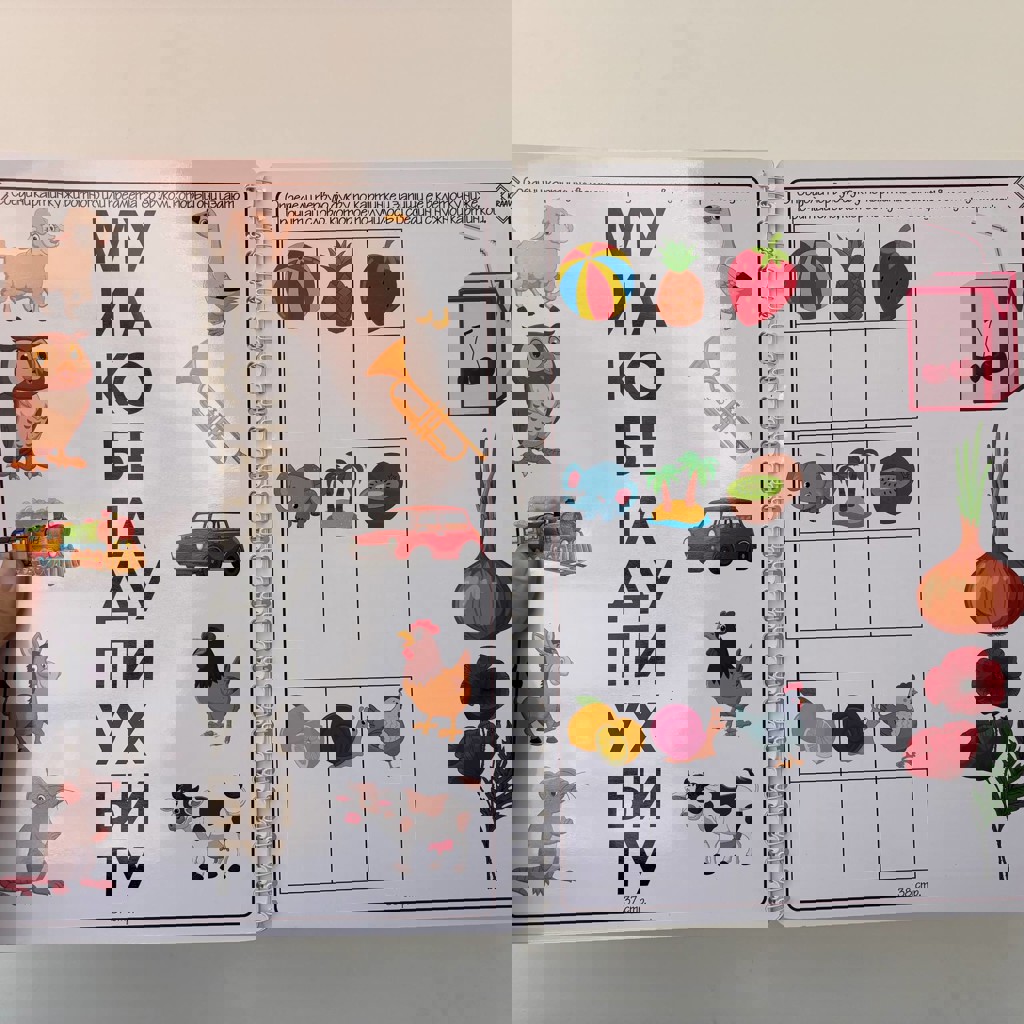 Ламинированная книга «пиши-стирай» буквы в хорошем состоянии. Идеально для знакомства с написанием печатных букв, первых попыток чтения.