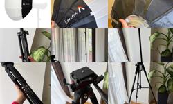 Набор включает 2 галогеновые лампы по 1000 Вт, сменные отражатели (диаметр 180 мм), защитные колбы из стекла. Световое оборудование: 1 софтбокс 60 x 60 см, 1 зонт, 2 штативы для света, 1 сумка для транспортировки. Состояние: этот набор почти новый. Использовался для нескольких фотосъемок. Хранился в коробке долгое время. В результате резина на источниках света стала немного липкой, но это не влияет на работу ламп.