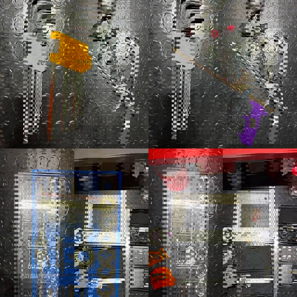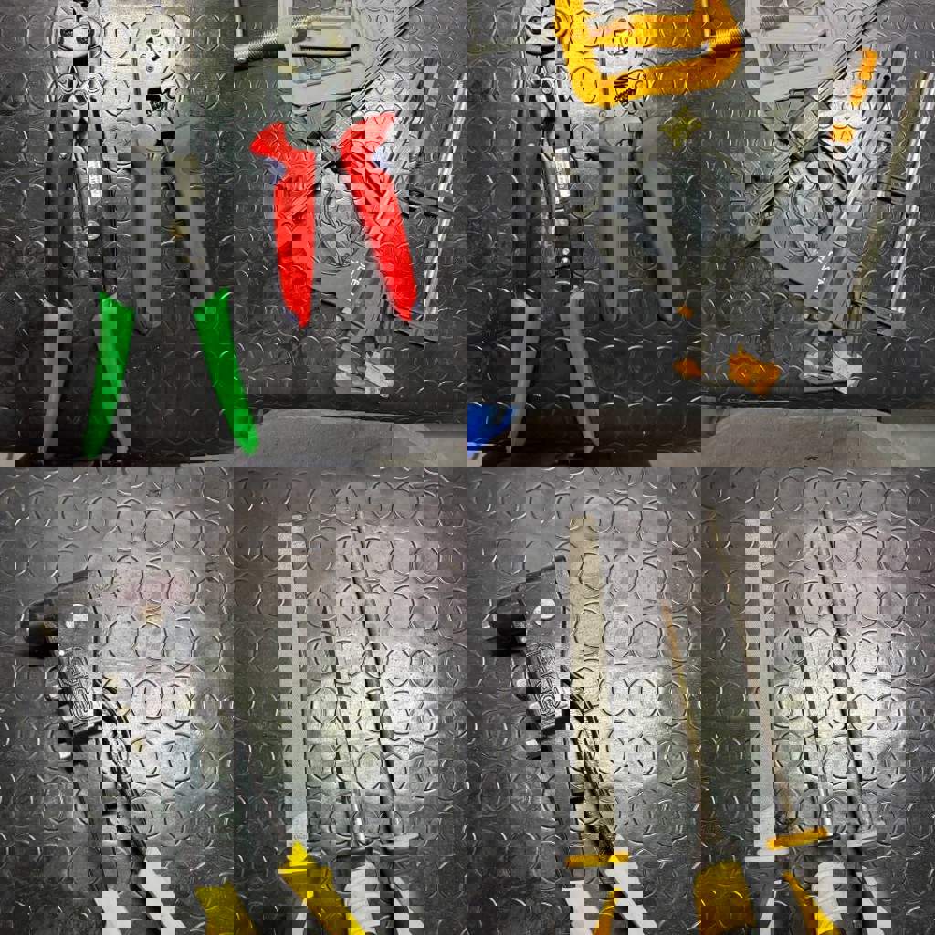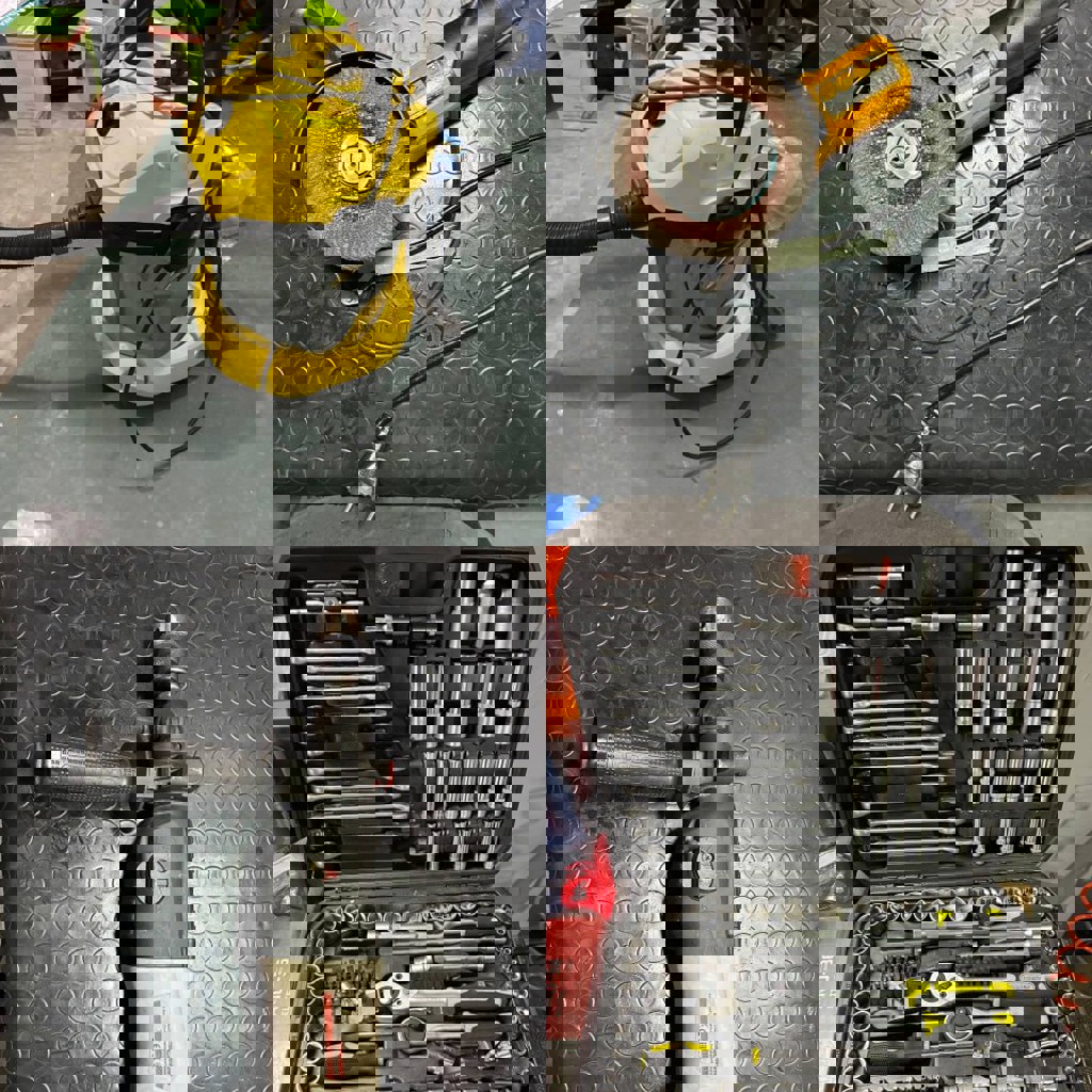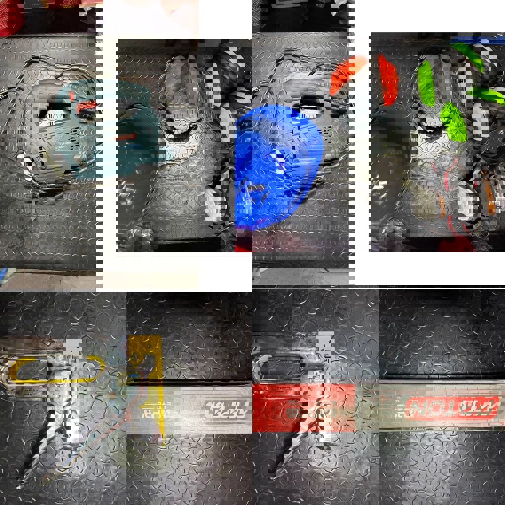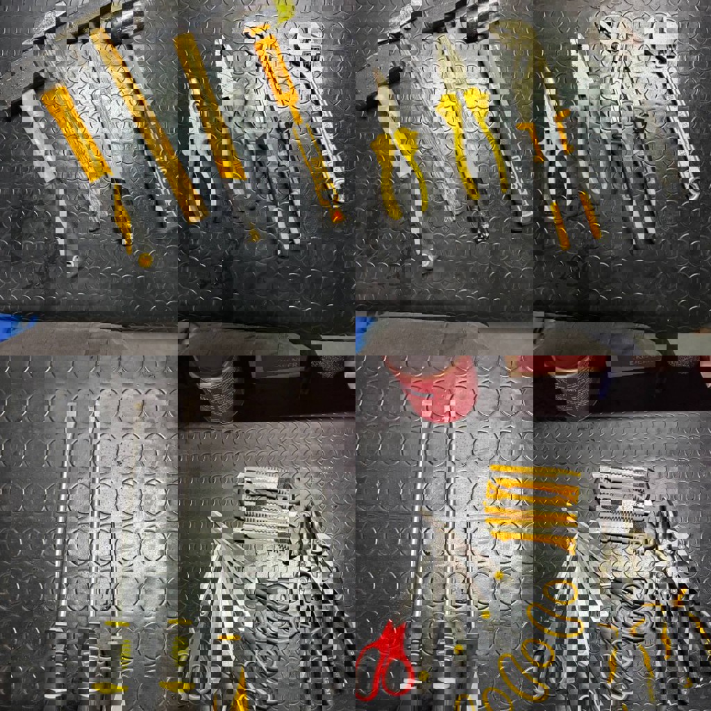 Струбцины, молотки, отвёртки, каски, уровень, ключи, удлинители, сварочный аппарат точечной сварки, огнетушители, расходные инструменты, измерительные инструменты (штангенциркуль, микрометр), пылесос, перфоратор, степлер, лобзик, зажимные инструменты для проводов, шуруповёрт, цепные тиски, офисная техника, кондиционеры, холодильник. Детали на фото