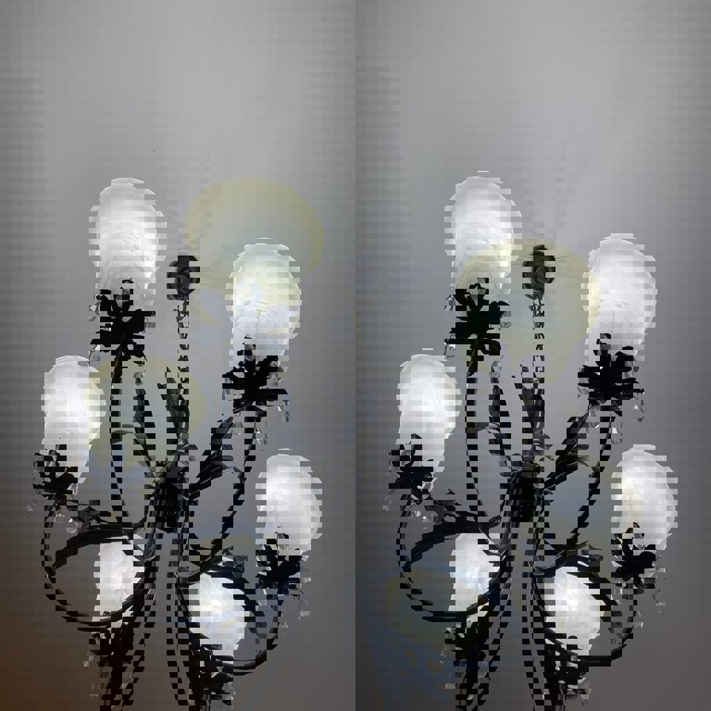 Элегантная люстра с виноградными листьями. «флористический модерн». У неё 6 матовых плафонов-чаш. Свет мягкий, рассеянный, как в лучших домах. Темный изогнутый каркас с листочками — это вам не хлипкий пластик из масс-маркета. Декоративные подвески игриво пускают зайчиков, когда в окно заглядывает солнце. Все плафоны на месте, подвески на месте. Готова переехать и сразу включиться в работу. Может работать как с двух клавишным так и с одно клавишным выключателем.