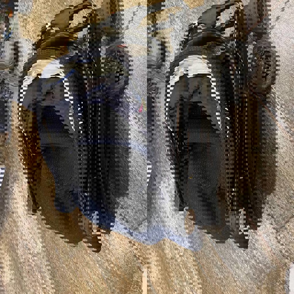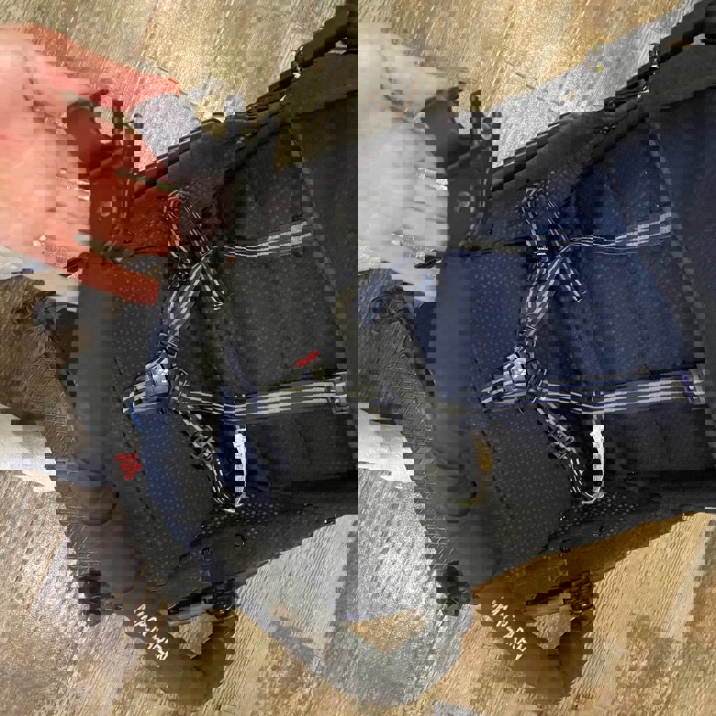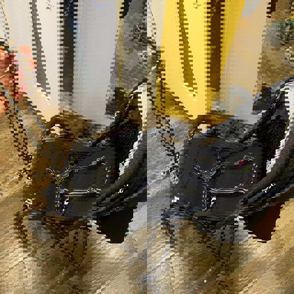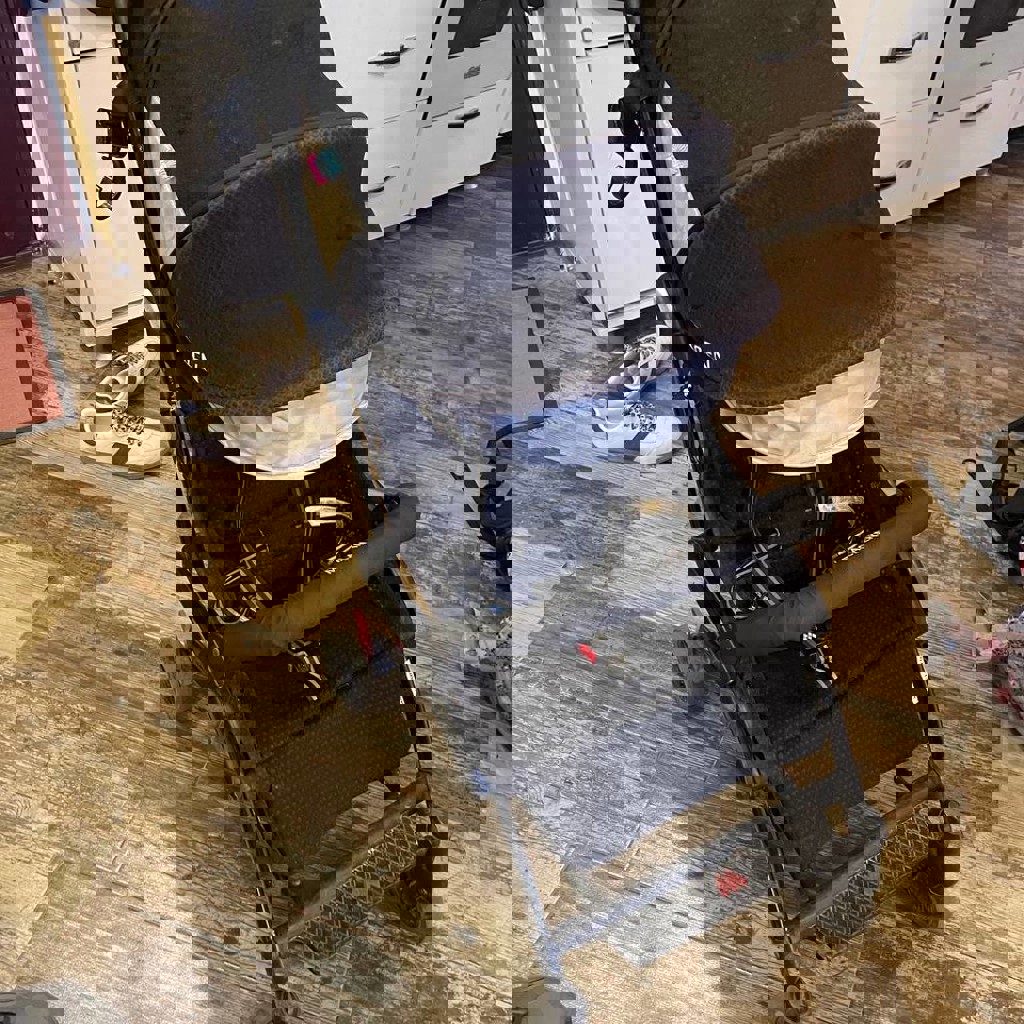 Легкая прогулочная коляска, подходит для поездок на самолете. Состояние - нормальное, ездит, тормоз работает, передние колеса фиксируются в прямом положении, складывается. Ремни имеются, но не использовались. Фиксирующая перекладина отстегивается при необходимости. Спинка дополнительно зафиксирована сзади велосипедной резинкой для более прямого положения.