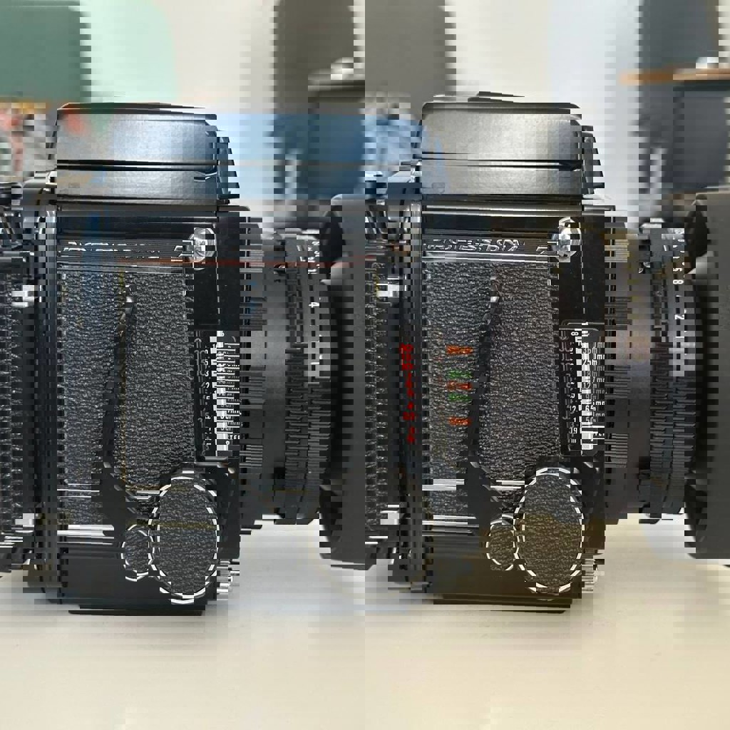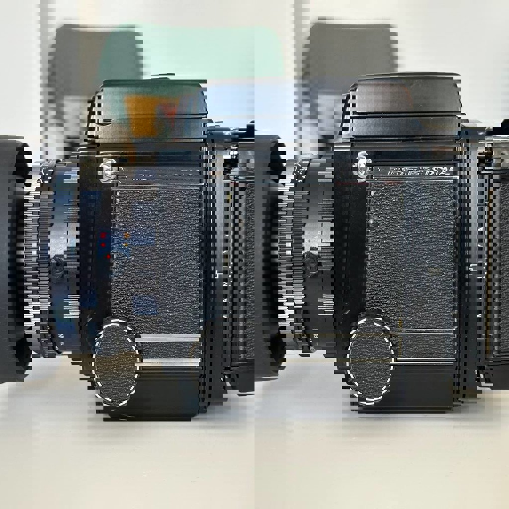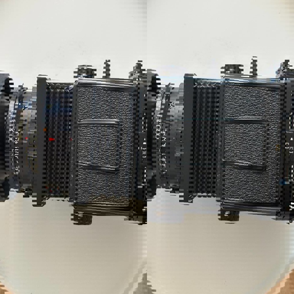 Среднеформатный пленочный фотоаппарат в почти новом состоянии с минимальными признаками использования. Механически идеален — все функции работают правильно. В набор входит: корпус камеры, задняя часть для пленки 120, объектив 90mm f/3.8, бленда и видоискатель с лупой.
