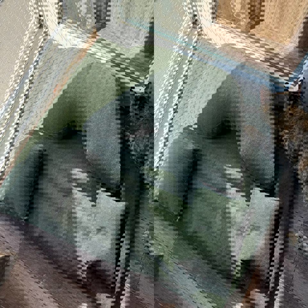 Подушка + мешочки под колени + коврик (всё набито гречневой шелухой). Состояние: 9/10 (коврик чуть-чуть покогтили коты, чисто визуальный дефект, на качество медитаций не влияет).