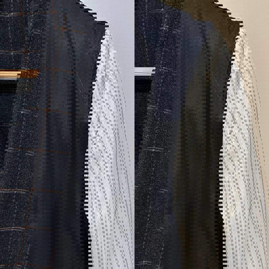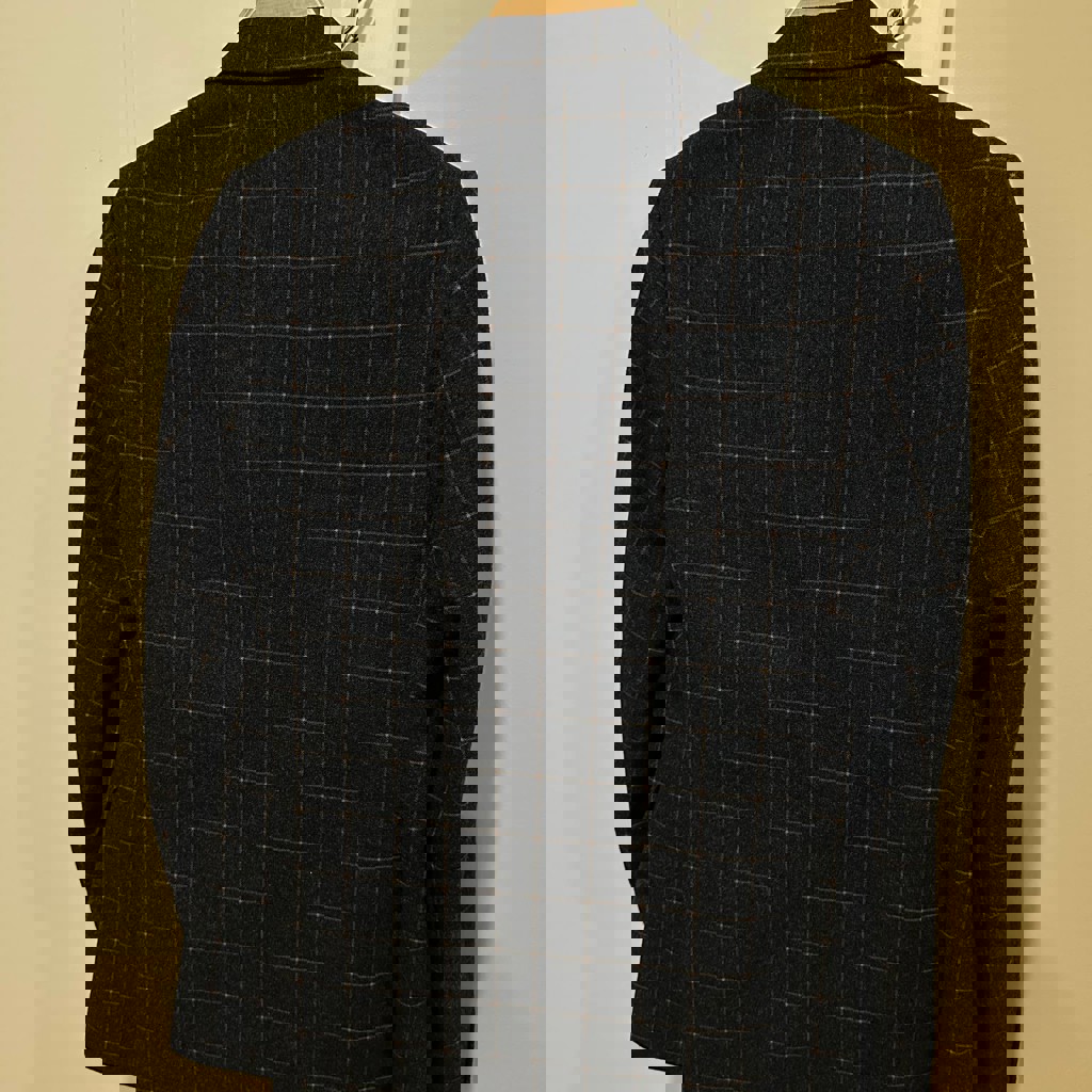 Мужской двубортный костюм на рост 165-173 темно-синего цвета. Размер: 46 (S), крой: приталенный. Состав: шерсть 65%, вискоза 20%, хлопок 15%.