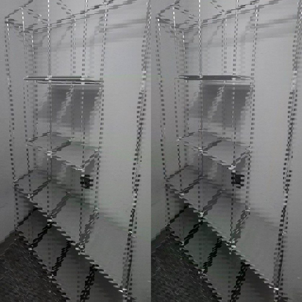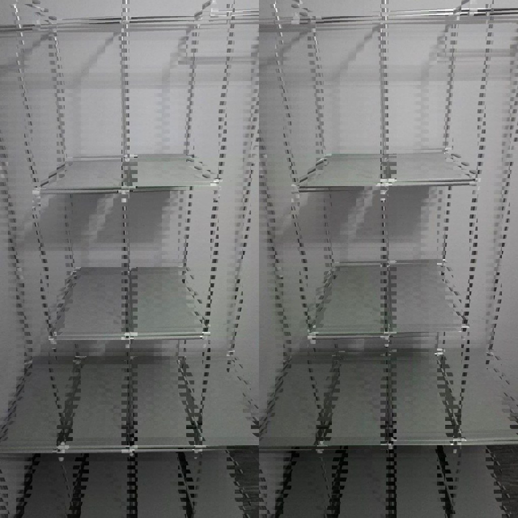 Четырехуровневый метталический шкаф. Прочная рама и тканевые полки, грузоподъемность 15 кг, сборка без инструментов (на фото показаны правильное положение деталей), компактный. Продам разобранным в коробке. Высота - 170 см. Длина - 164 см. Ширина - 42 см.
