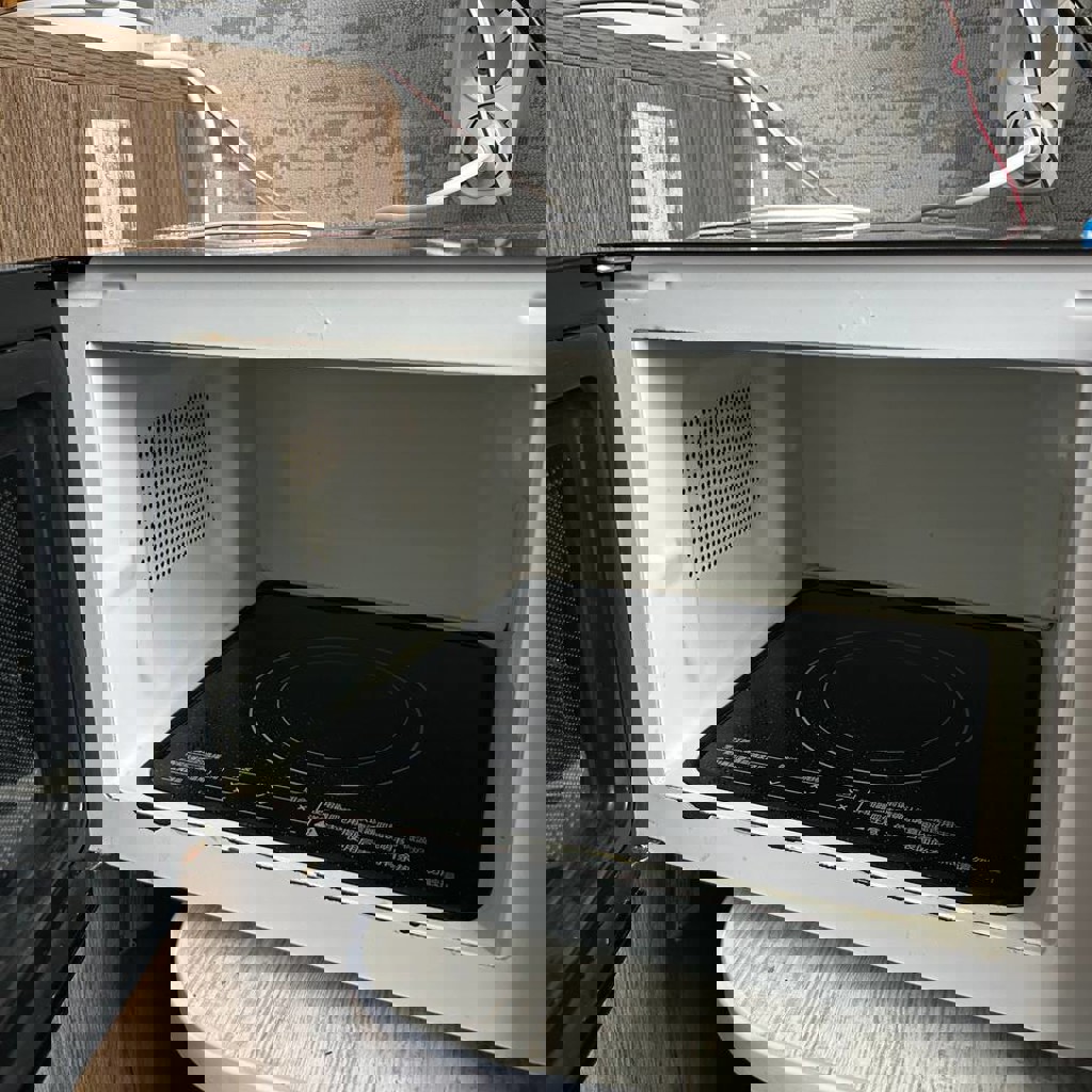 Микроволновка фирмы Galanz, работает отлично, греет снизу, а не сверху как в привычных микроволновках. Коробка есть.