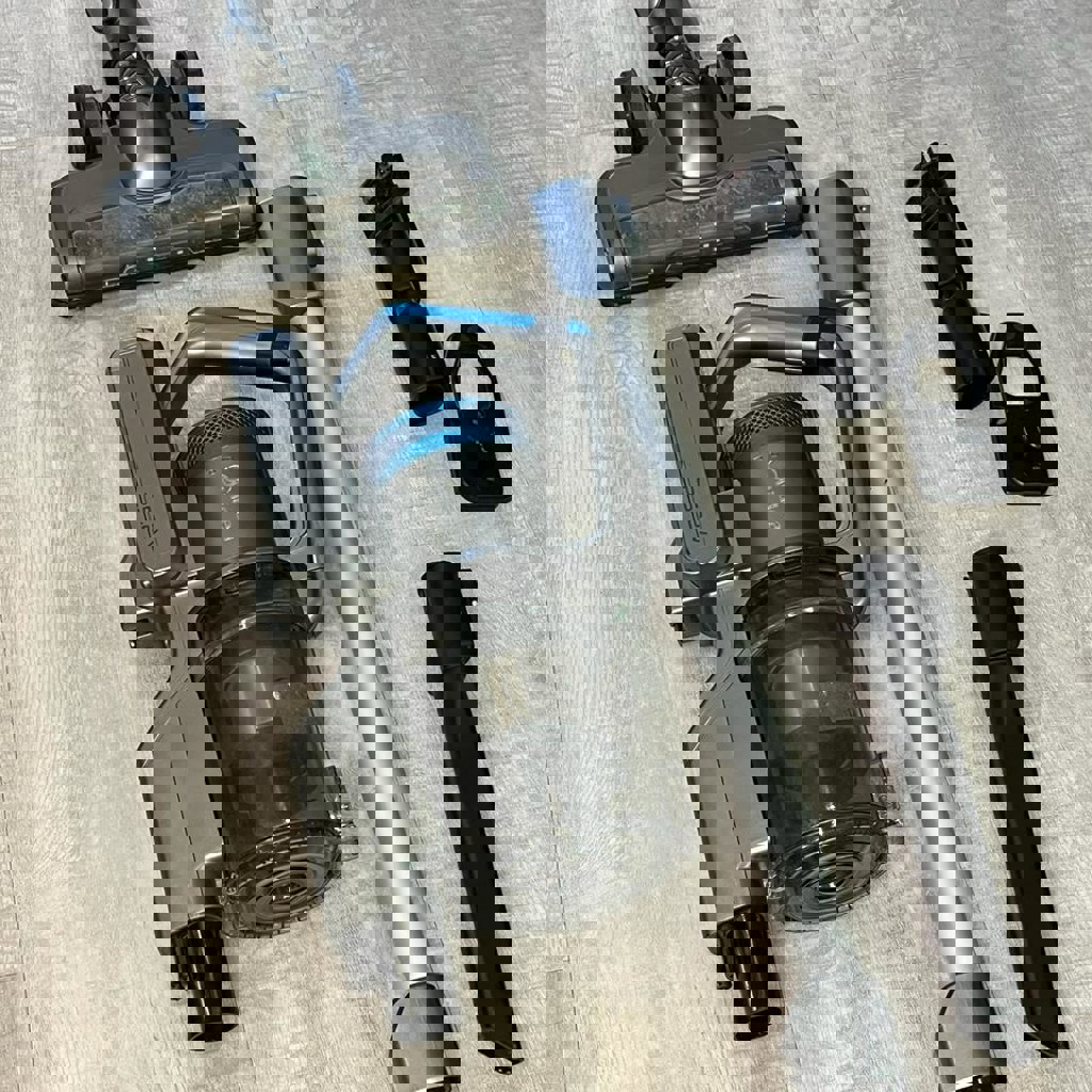 Беспроводной ручной пылесос 2-в-1. Предназначен для сухой уборки. Потребляемая мощность составляет 150 Вт, мощность всасывания — до 24 Вт. Работает от аккумулятора. Использует прозрачный контейнер объемом 0,3 литра вместо мешка, что позволяет контролировать его заполнение. Обладает эргономичным дизайном, легким весом (около 1,4 кг) и удобным расположением кнопок управления на рукоятке. Составная труба всасывания. Заявленный уровень шума составляет 79 дБ. При переезде потерялась зарядка и была повреждена рукоять.