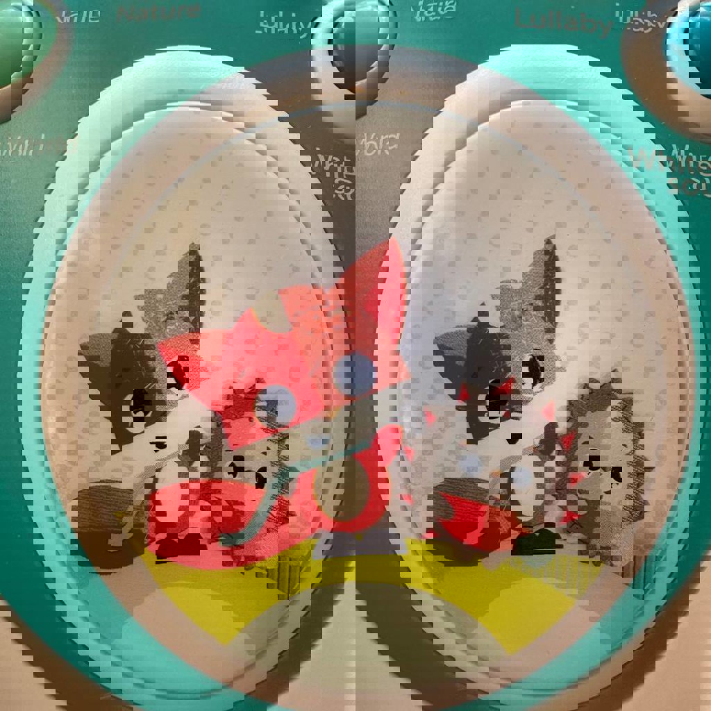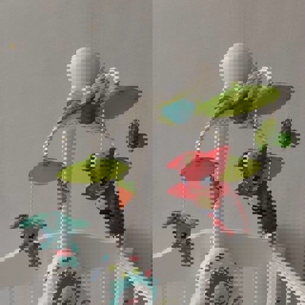 Лучший мобиль, где ребенок лежа на спине видит не дно игрушки, а рассматривает саму игрушку и следит за их вращением. Можно использовать как мобиль, бумбокс и ночник. Воспроизводит до 18 различных мелодий в 6 музыкальных категориях (джаз, классика, звуки природы и т.д) непрерывно до 40 минут. Есть два уровня громкости. Сыну с 6 мес очень нравилось нажимать на кнопочки. Состояние отличное. Нюанс: есть потертости на центральной кнопке, - видно на фото.