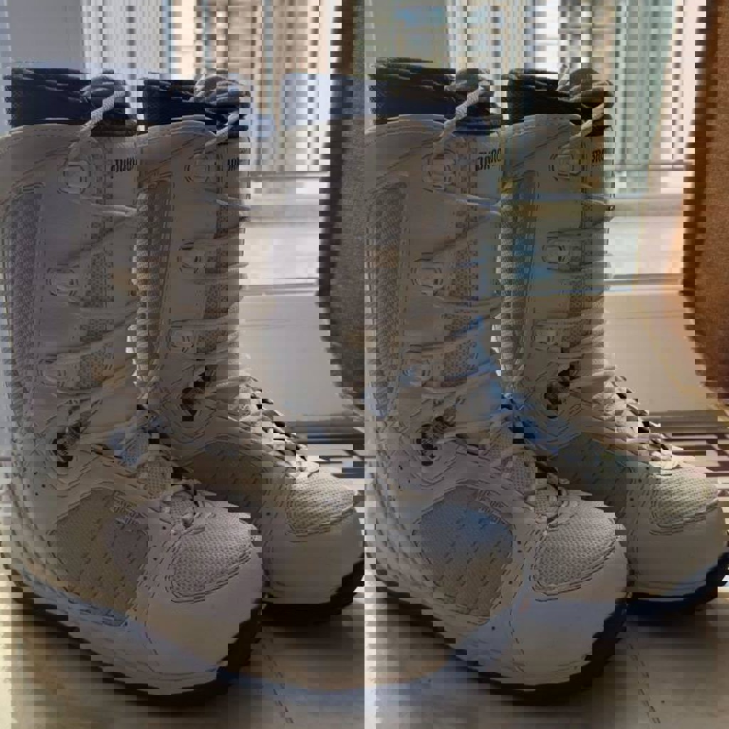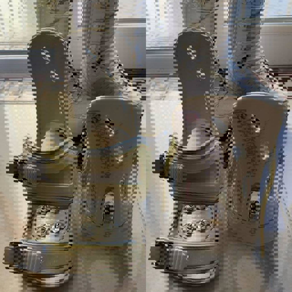 Жёсткость (Flex): 4/10. Хайбэк: женская анатомическая форма, с небольшим углом наклона — поддерживает голень, не давит при поворотах. Ankle Strap: широкий, мягкий, с двухслойной подкладкой и регулируемым положением. Бакли: алюминиевые быстрозажимные с плавным ходом и реверсом. Амортизация: пенная подкладка под стопой + EVA-вставки для гашения вибраций.