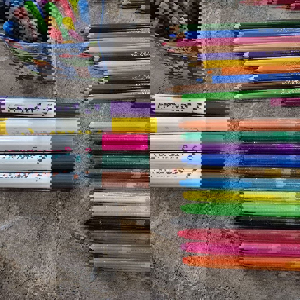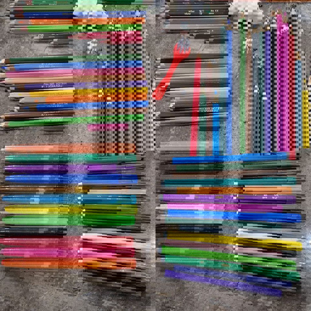 ПАКЕТОМ набор для рисования: карандаши Bic, отлично точатся, не ломаются, яркие, сочные цвета; Карандаши koh I noor точатся похуже; color peps точатся средне, яркие; карандаши восковые; фломастеры (все пишут); динозаврик для раскрашивания.