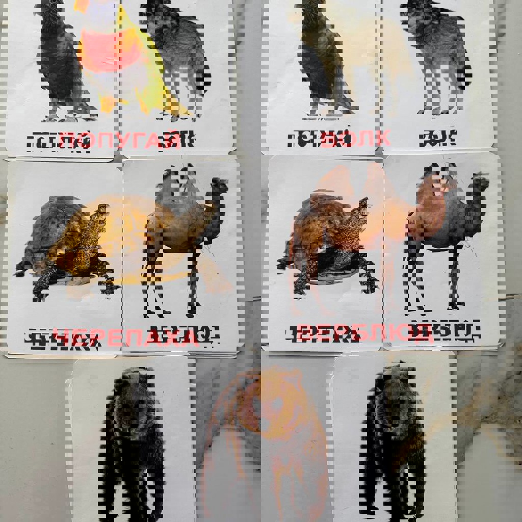 Изучаем цвета, слова, цифры. 5 комплектов карточек по 20 штук. (Животные, цвета, овощи, фрукты), но затерялись две карточки. (Одно домашнее животное и один овощ). Полный набор без двух карточек.