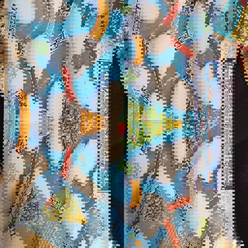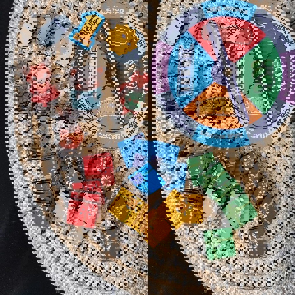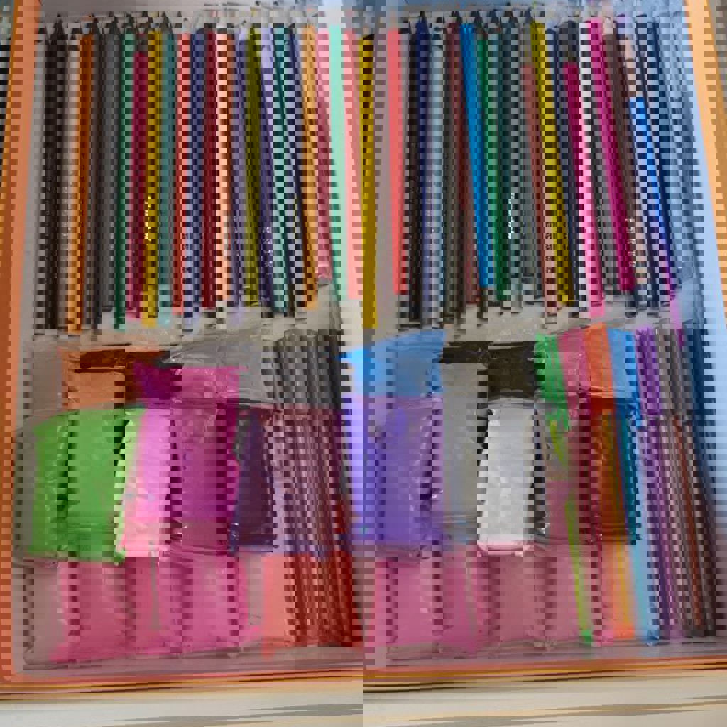 Большой набор для творчества, включающий карандаши, цветные ручки, фламастеры, мелки для улицы, восковые мелки, краски, воздушный пластилин, механическую точилку, цветную бумагу, настольную игру и наклейки.