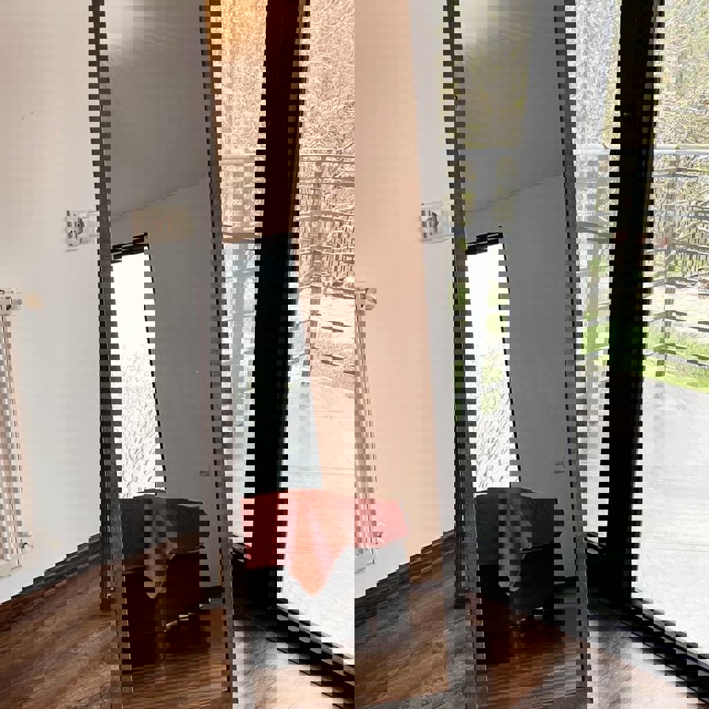 Стильное напольное зеркало в тёмно-серой раме. Можно ставить на пол — есть удобная задняя опора, не требует крепления к стене. Размер: 150 × 50 см. Отлично подойдёт для спальни, гардеробной, прихожей или студии.