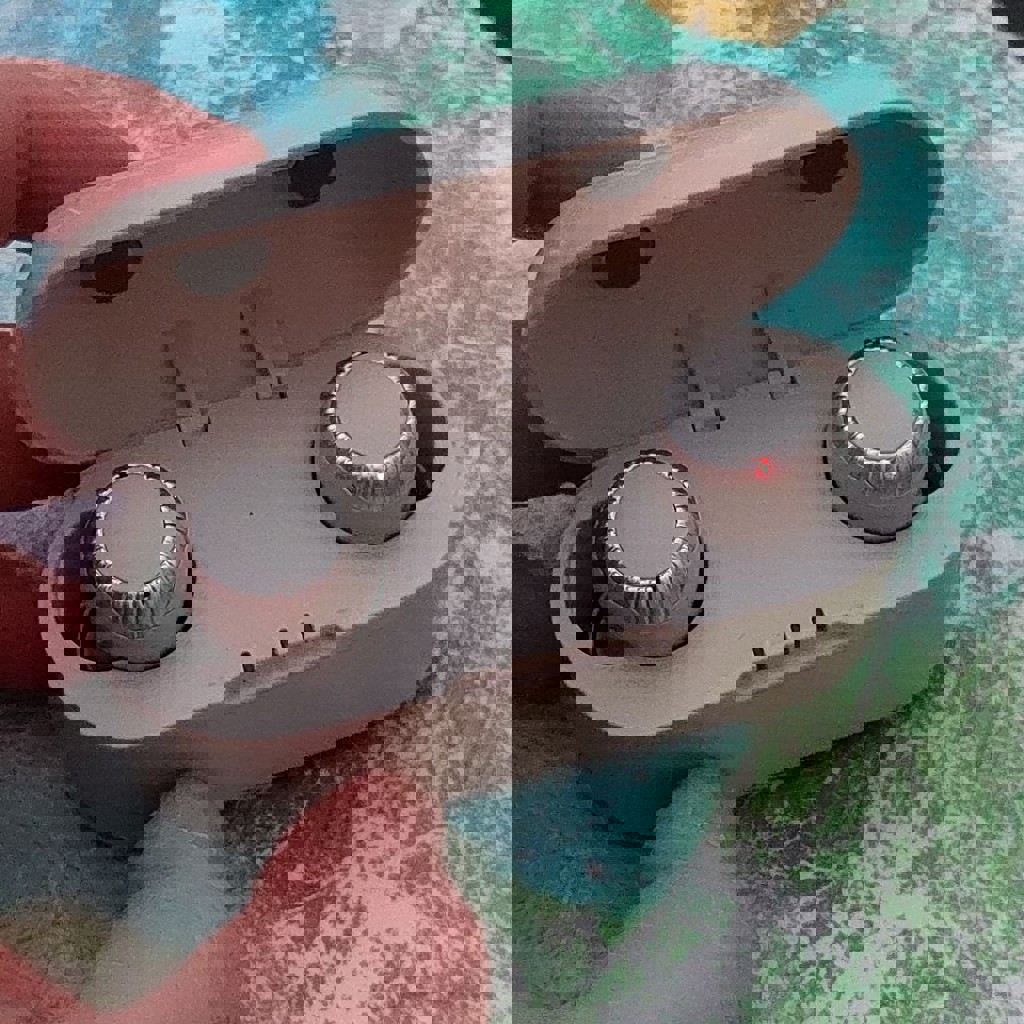 Светло-серые, Bluetooth 5.0, с небольшим нюансом - левый наушник иногда капризничает при зарядке - решается фиксацией в гнезде, и все работает, но из-за этого цена.