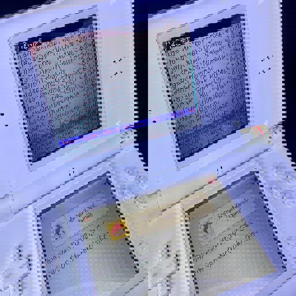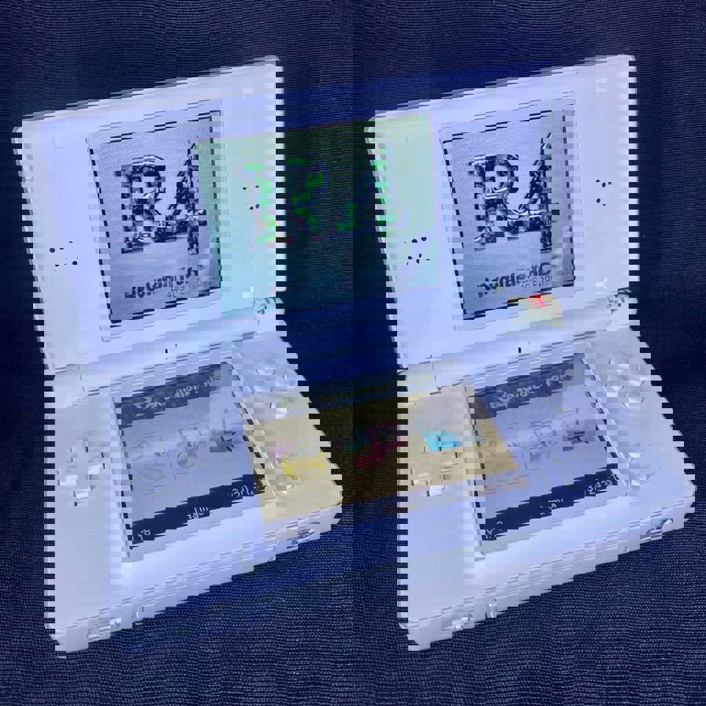 Nintendo DS Lite с R4 Flash картриджем, в комплекте адаптер и провод питания, micro SD на 2GB. Единственный минус: от возраста лопнул шарнир. Эмоции и ностальгические чувства не нарушает.