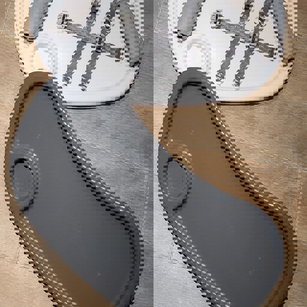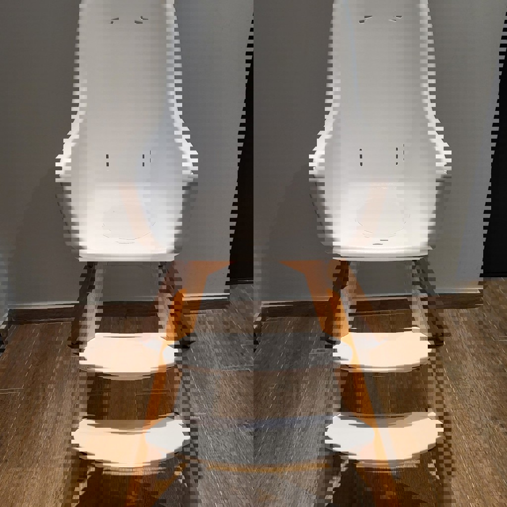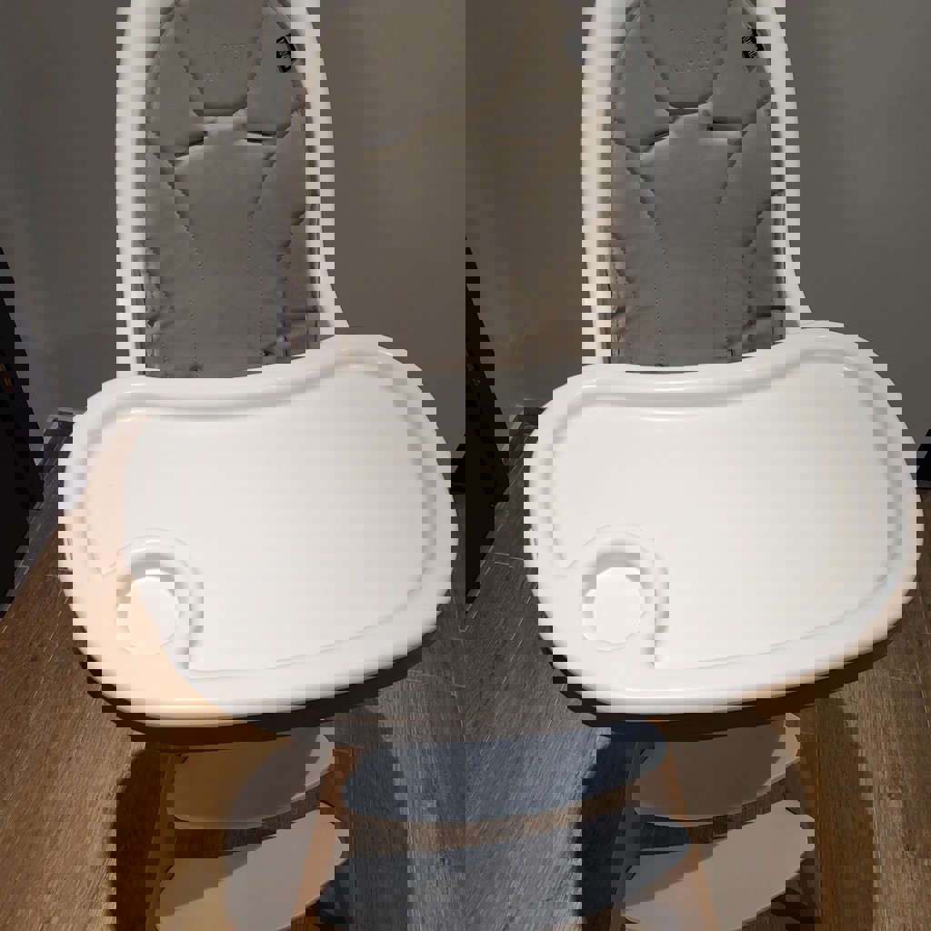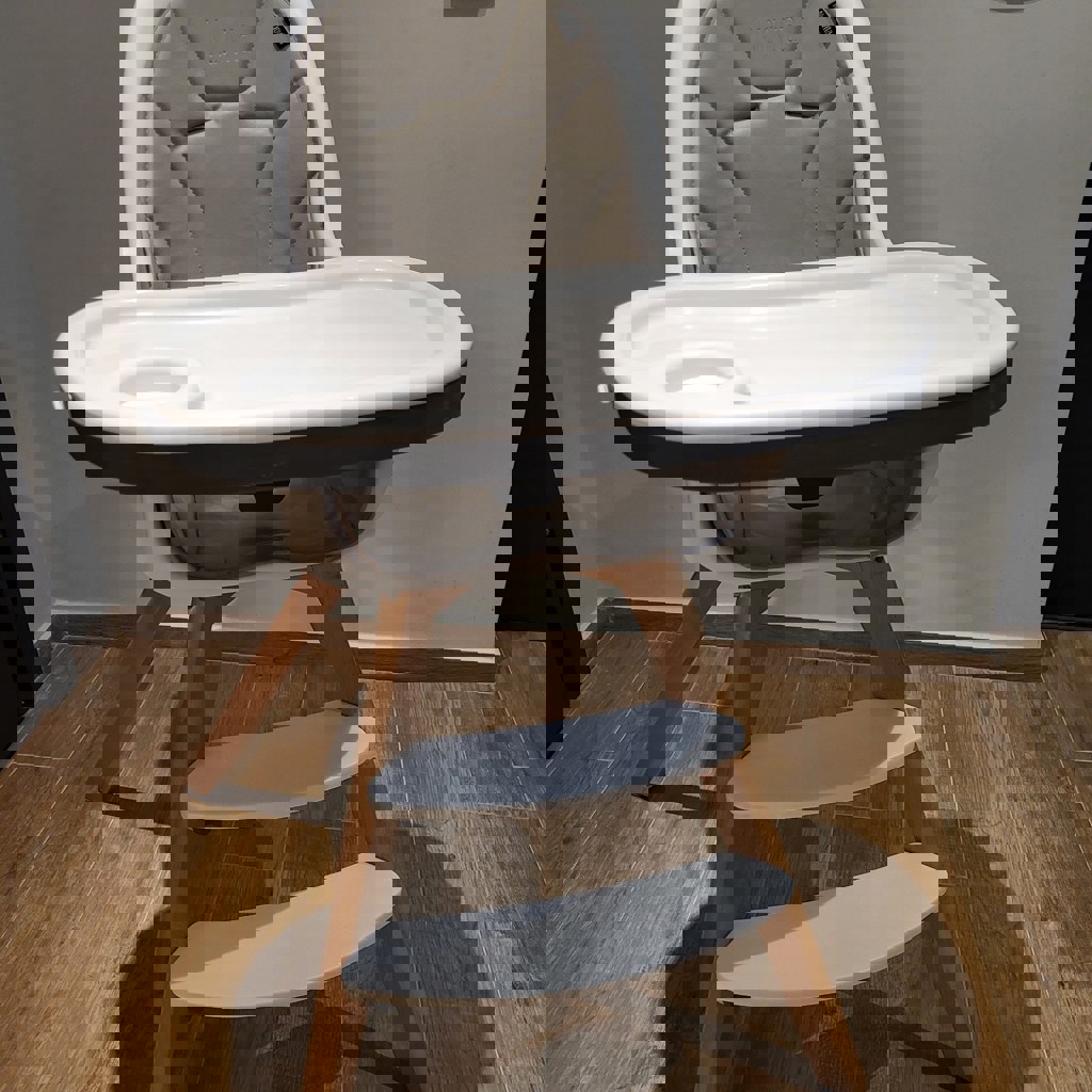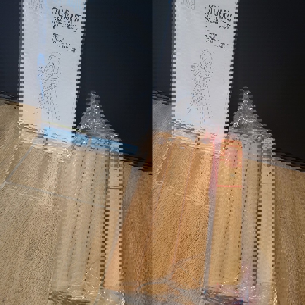 Два варианта деревянных ножек (высокий стул на фото рассчитан на 15 кг, низкий даже ни разу не распаковывали - на 20 кг), скандинавский дизайн. Двойной съемный поднос, ремни безопасности, инструкция. Подойдет детям от 6 месяцев до 3 лет.