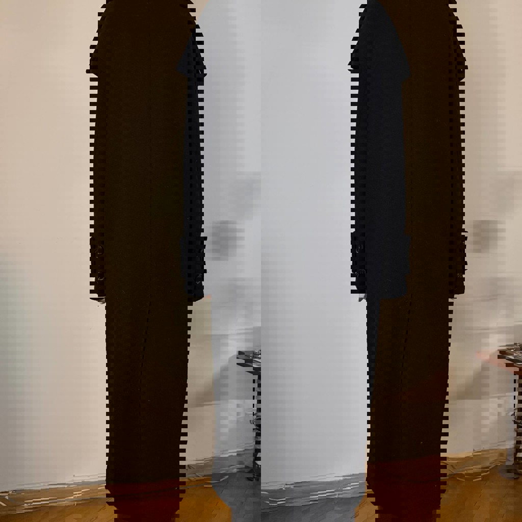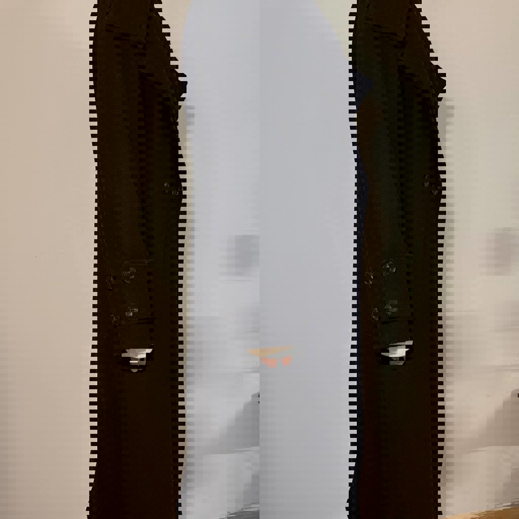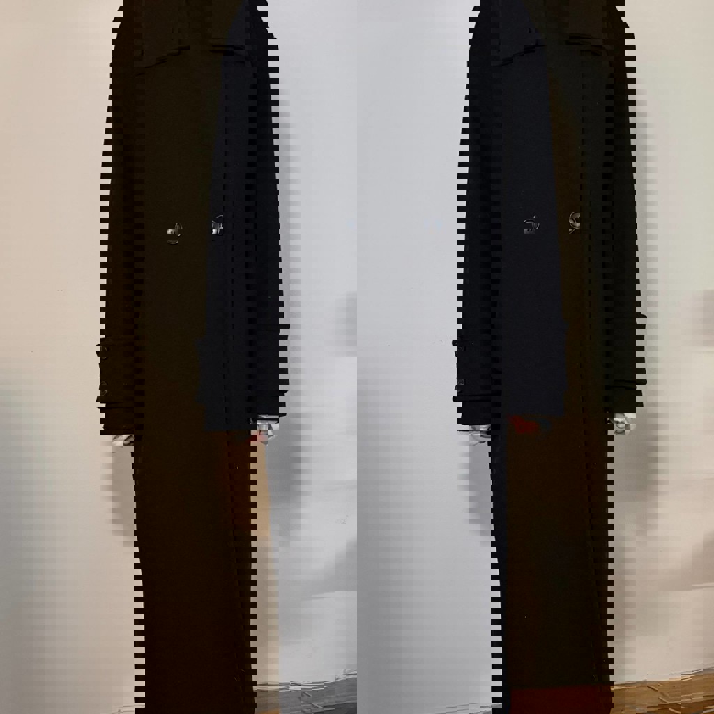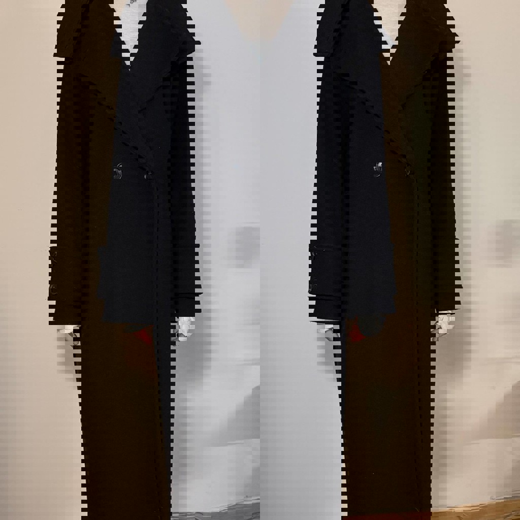 Пальто двубортное с воротом Sela, чёрное. Размер S-M. Материал не знаю, предположительно драп с шерстью. В отличном состоянии.