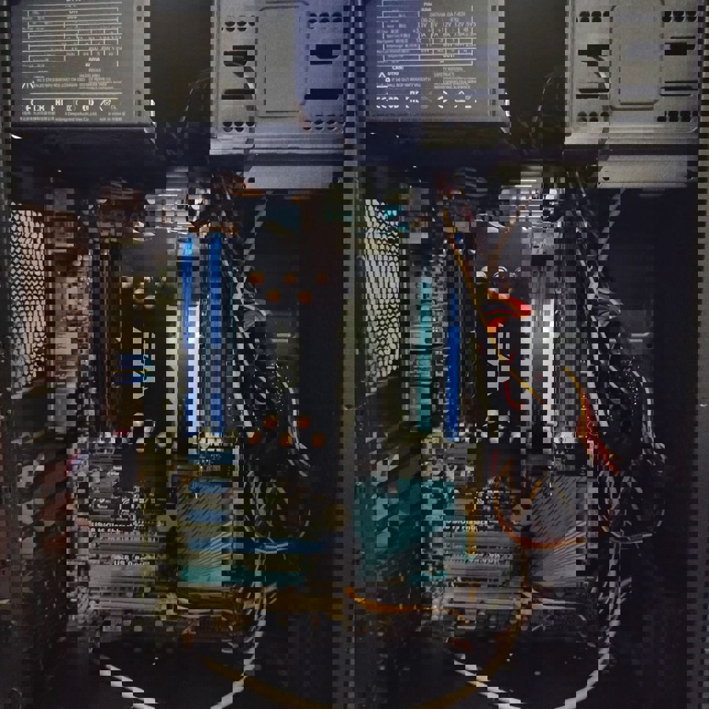 Материнская плата - ASUS P9X79. Процессор - 2630v2 с башенным кулером. Оперативная память - 12 гб ddr3. Блок питания - dep cool DN500 (500watt). Корпус простой. Можно собрать очень крутой сервер. У материнки нет возможности подключить usb 3.0 к корпусу, контакты отпаяны.