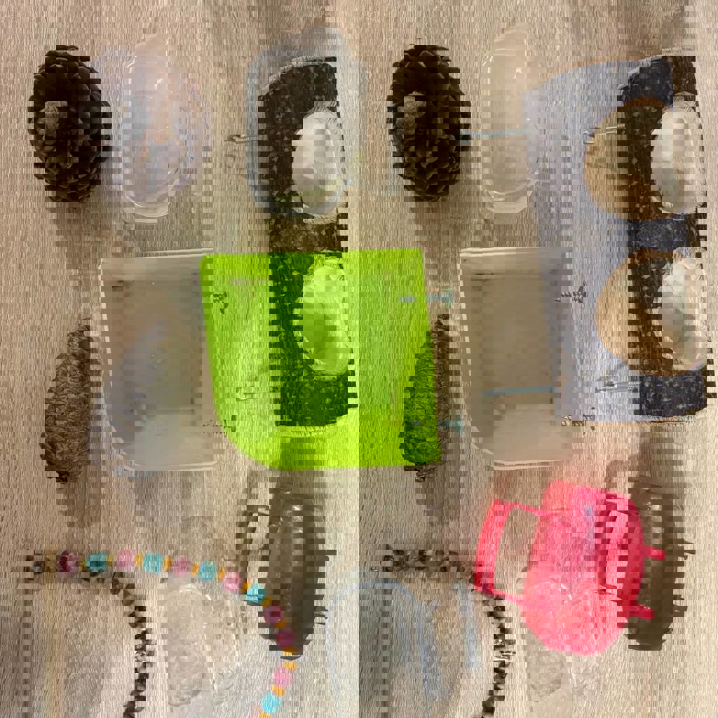 4) 2 поилки, 2 основные + 2 дополнительные кормушки, 2 качели, 2 шишки, кормушка для травы