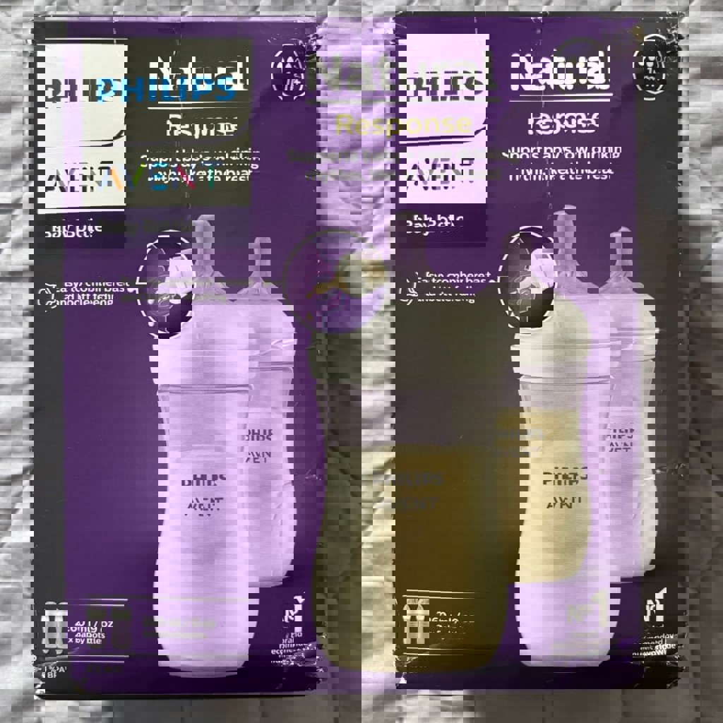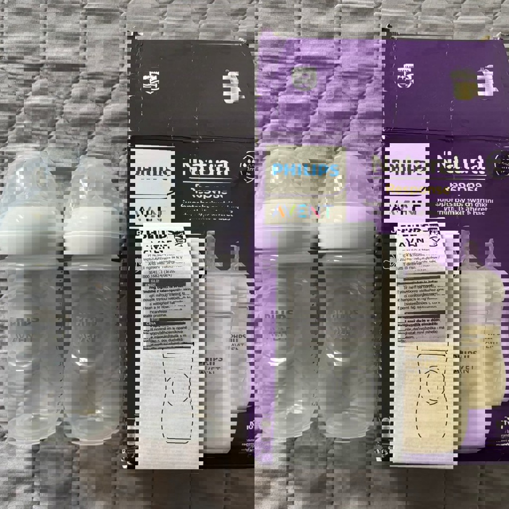 Абсолютно новые — даже не успели использовать. Ждали доставку 2 недели, но в итоге перешли на стеклянные бутылочки. Очень классные по качеству: мягкая соска, имитирует грудное кормление — малышу легче привыкнуть. 2 бутылочки по 260 мл. Оригинал Philips Avent. Соски Natural Response (медленный поток). Без BPA. Коробка немного помялась при доставке, сами бутылочки идеальные.