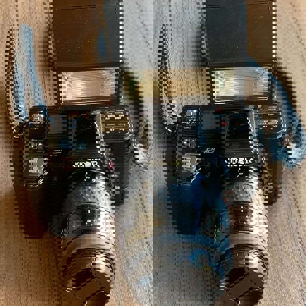 Пленочный фотоаппарат Minolta 7000AF + объектив Minolta AF 35-105 мм + вспышка Minolta 2800AF. Состояние: на пластиковой крышке есть небольшая трещина (на работу никак не влияет), в остальном как новая.