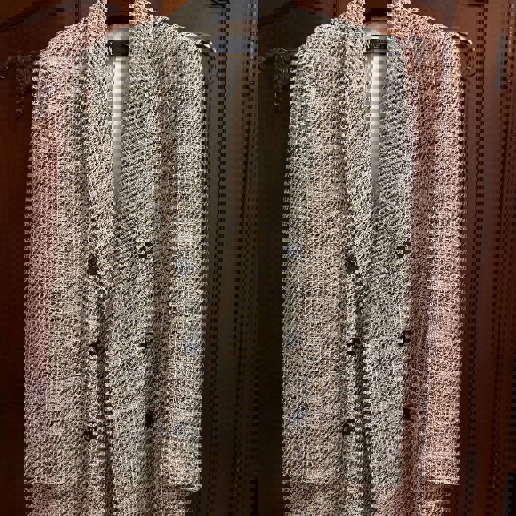 Размер S/M. На шелковом подкладе, пуговицы с обеих сторон и на рукавах. Длина по спине от плеча 70 см.