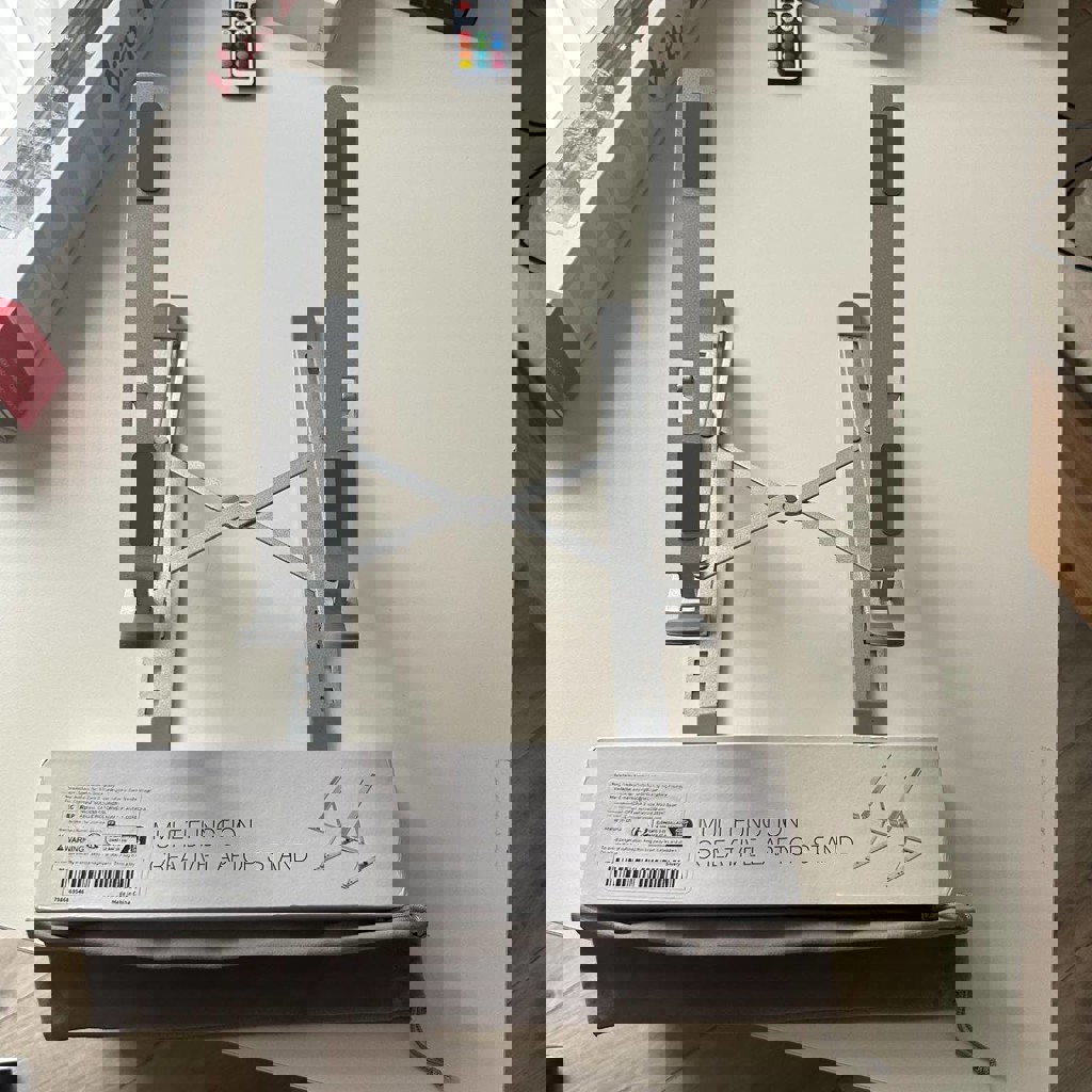 Удобная и устойчивая подставка под ноутбук с разными креплениями сверху и снизу, в мешочке и коробке. Покупалась под Mac.