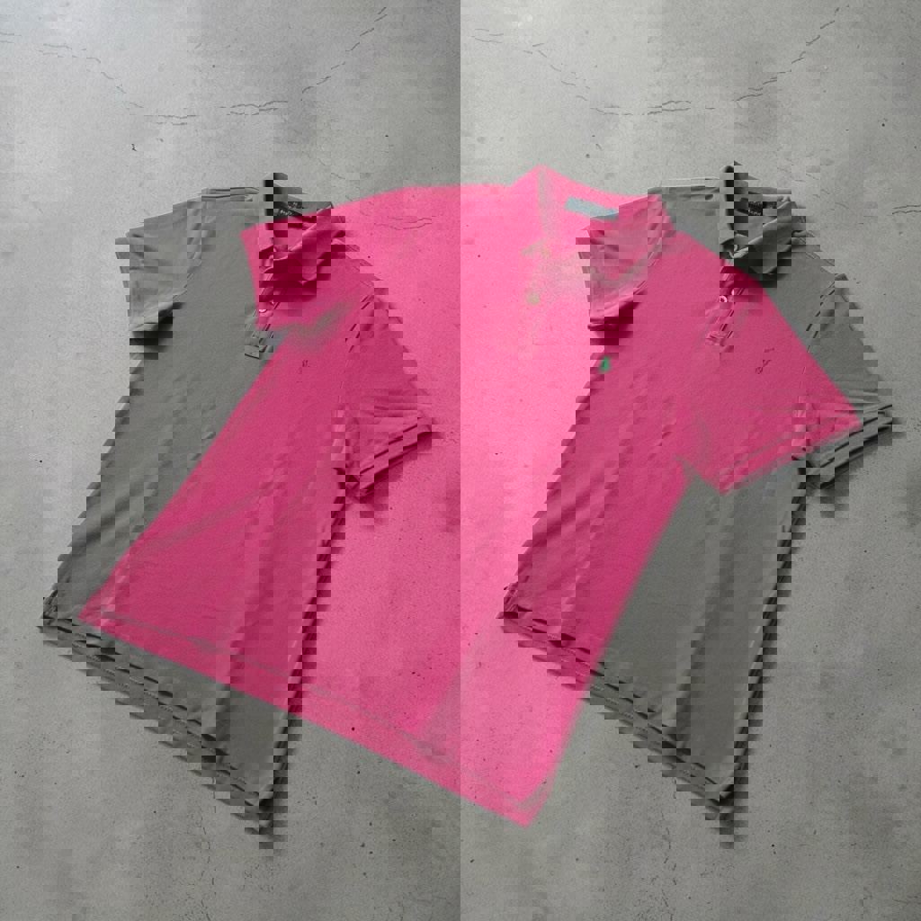 Ярко-розовое унисекс поло, короткий рукав, классический воротник, застежка на пуговицы, фирменный вышитый логотип на груди. Размер: M-L. Состав: 100% хлопок.