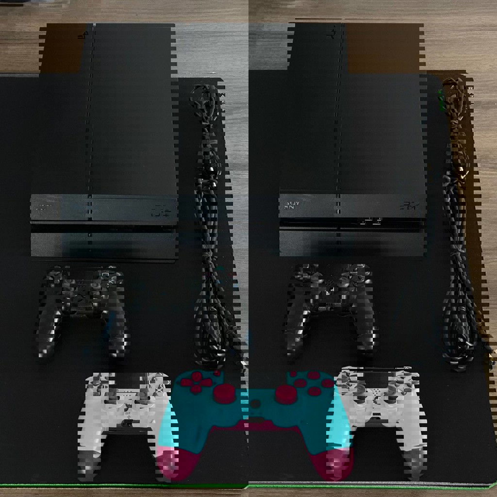 PS4 Fat 1TB, 2 джойстика (черный ориг, фиолетовый новый, но не ориг), все нужные кабели для старта, 2 игры (Jedi Fallen Order, Street Fighter 5)