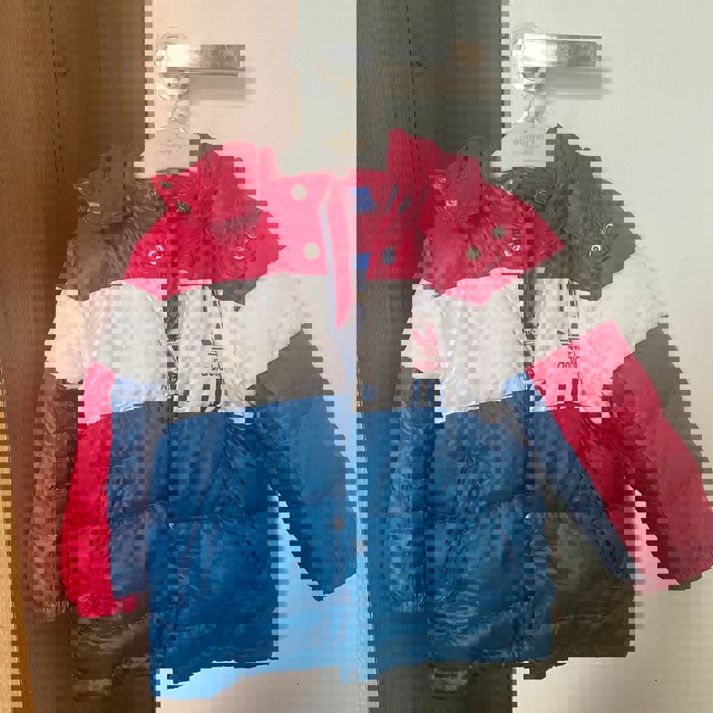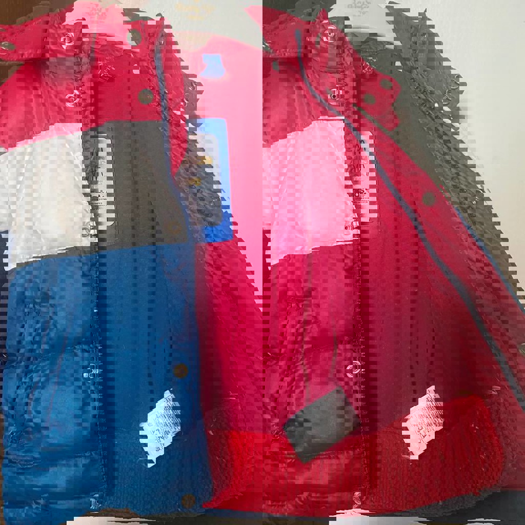 Пуховик 86 - 92 рост, внизу подвязан пояс, можно отпороть) есть пятнышки на белой части. 15 лари