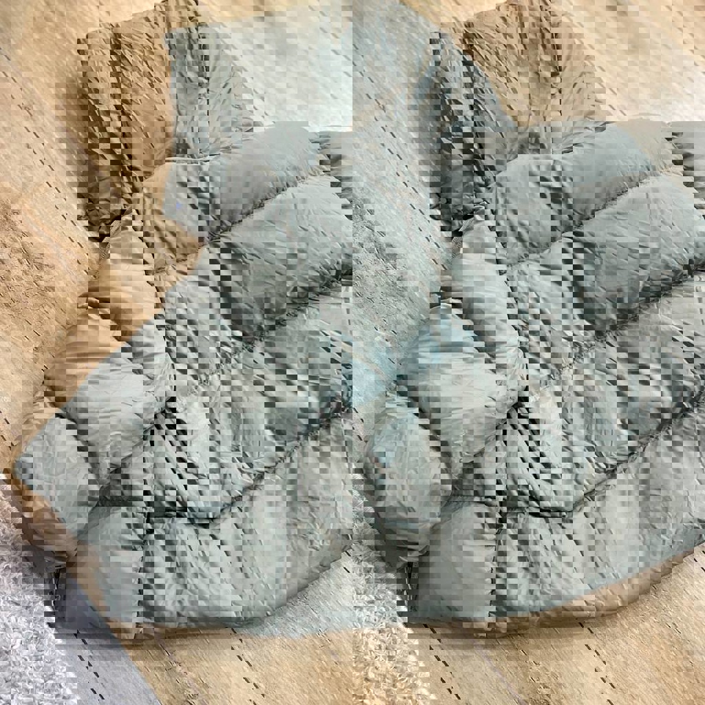 Воздушный, теплый. Наполнитель пух/перо. Размер 104, 3-4 года. Сзади есть дефект, не очень заметная светлая полоска.
