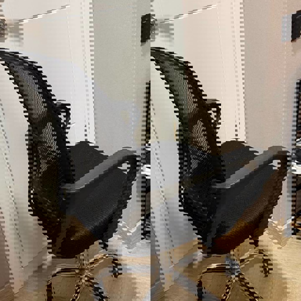 Офисное кресло. Сидеть можно, немного скрепит если откидываться назад, есть небольшие дефекты на сиденье (пятна) и ручке (щенок погрыз), эксплуатации не мешают, на фото видно.