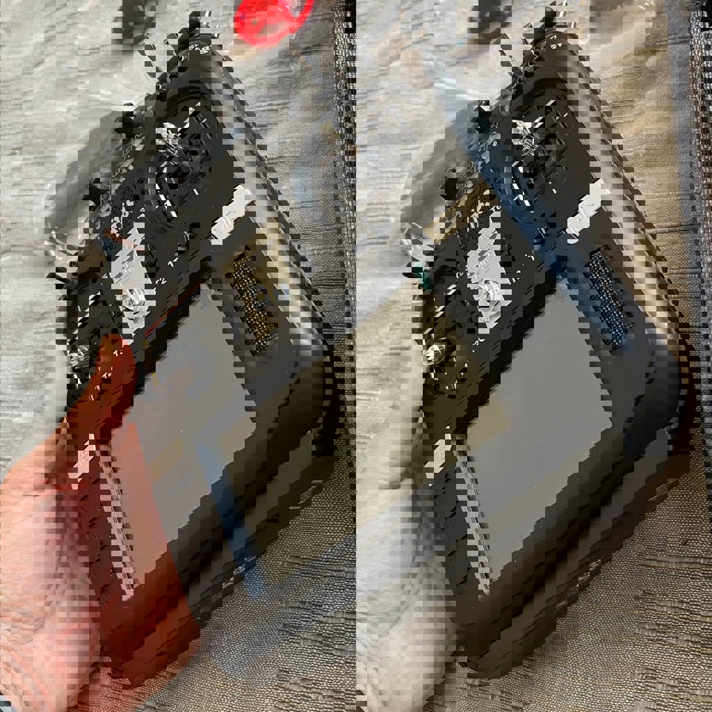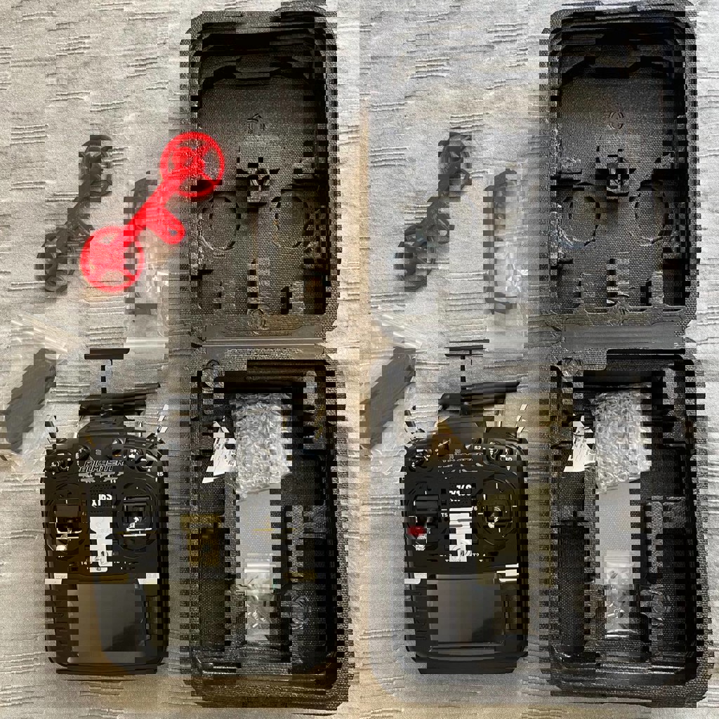Аппаратура (пульт) с защитой на стики и складной ручкой. БУ супер мало, родные пак и коробка, лежит без дела уже год.