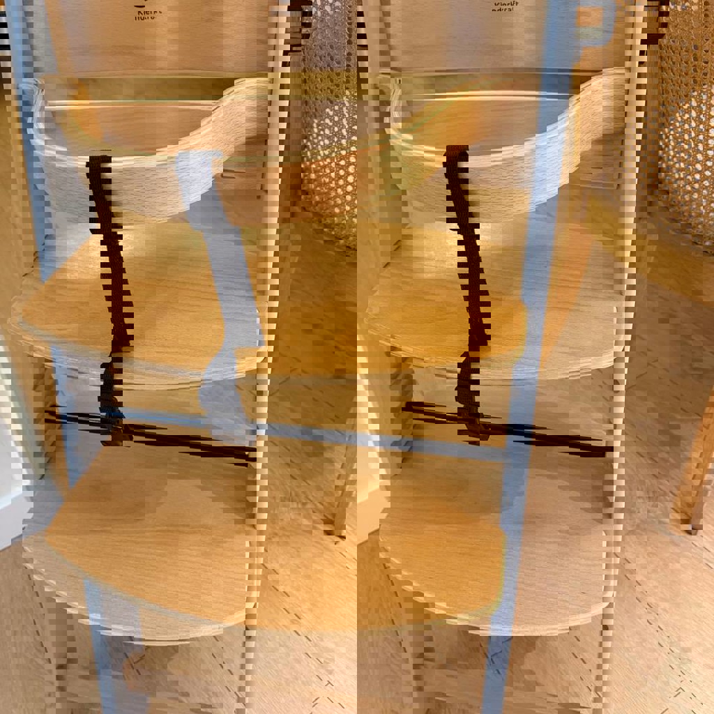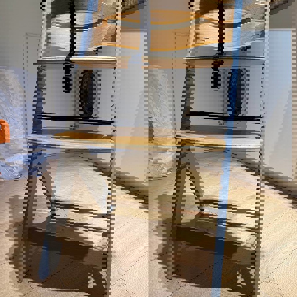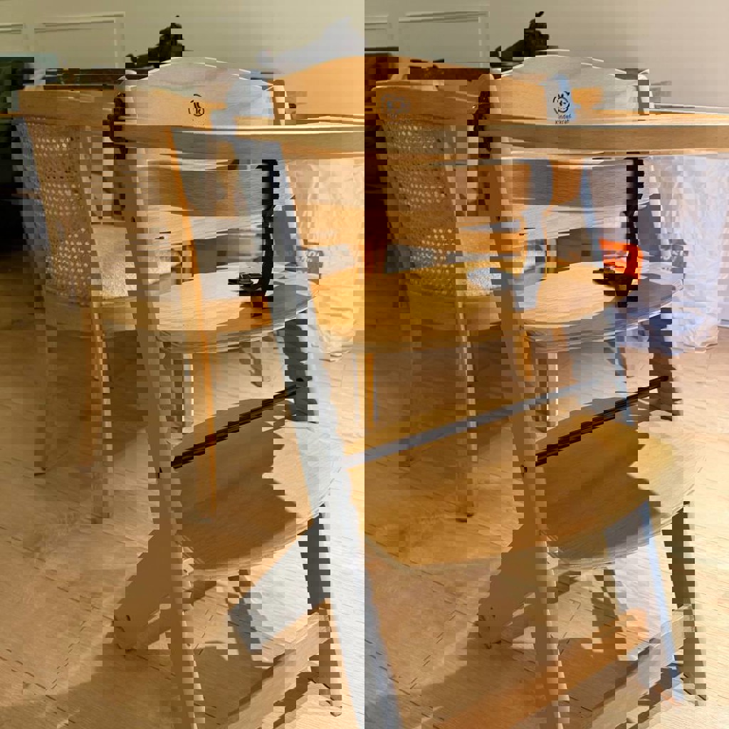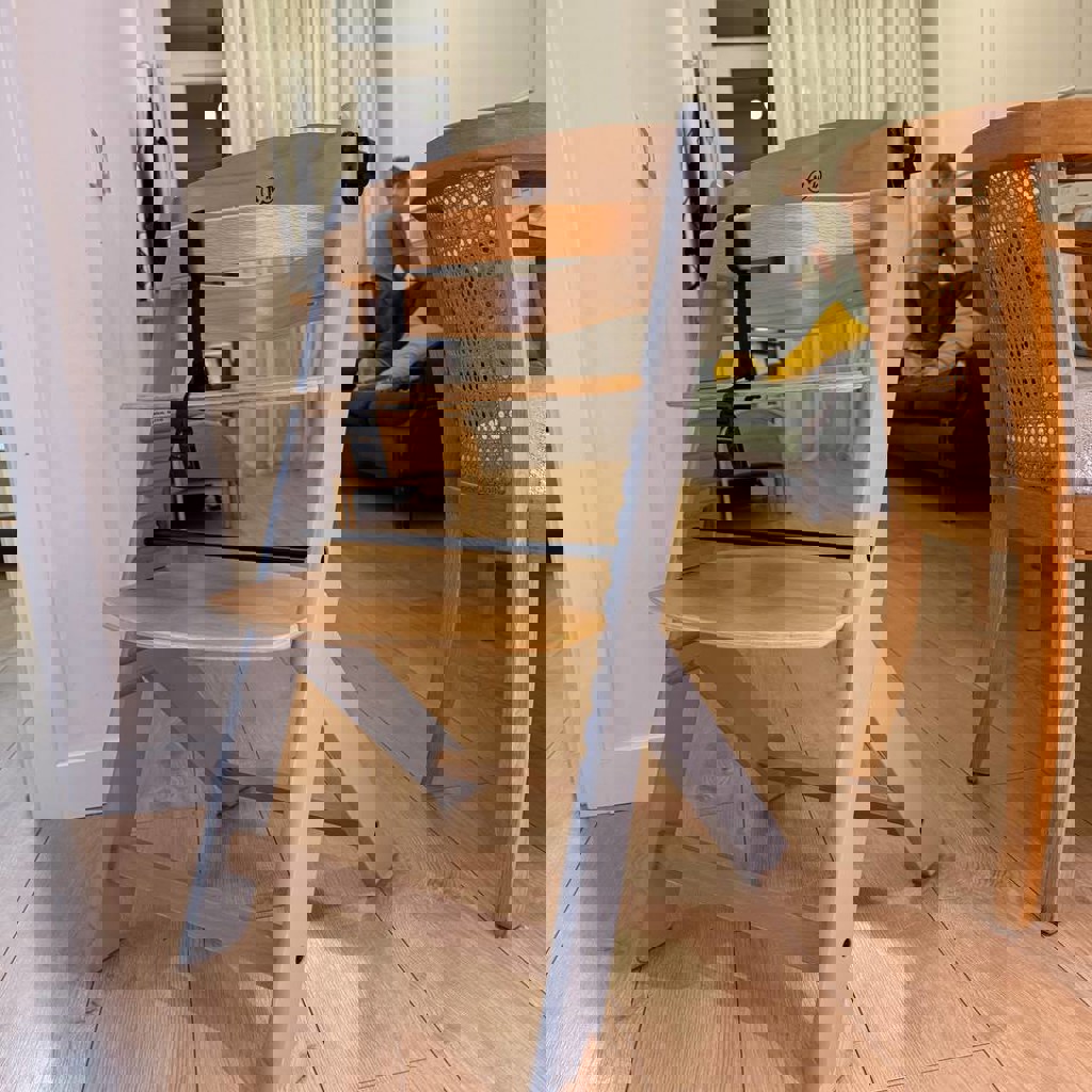 Детский очень классный растущий стульчик. Можно использовать лет до трех, столик открепляется, а ремень и передний деревянный фиксатор — нет.