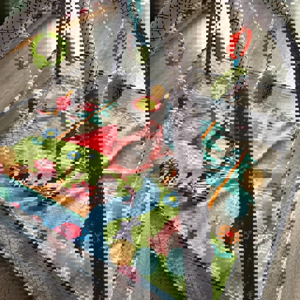 Коврик-трансформер с бортиками, в хорошем состоянии. В комплекте съемные дуги и подвесные игрушки (погремушки, грызунки, мягкие зверята) и набор пластиковых шариков.
