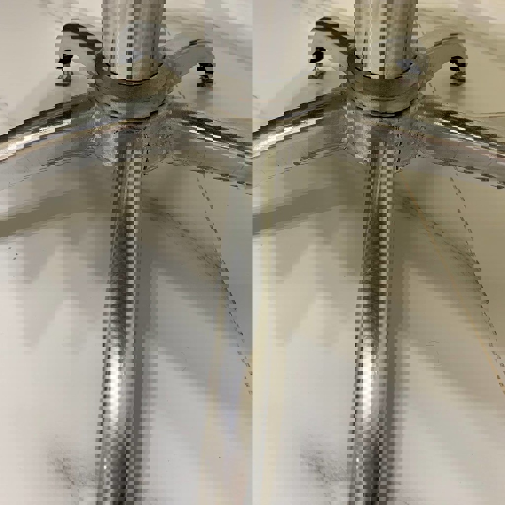 Ретро-кресло в итальянском стиле (80–90-е): высота 50–55 см (европейский стандарт, не низкое китайское), гидравлика работает идеально, дизайн огонь (хром, подлокотники-дуги). Нюанс: пятилучье (основание) когда-то пятилось — заварено было, трещинка рядом со швом (на фото). Требует ремонта (сварки) или замены самого основания - пятилучья.