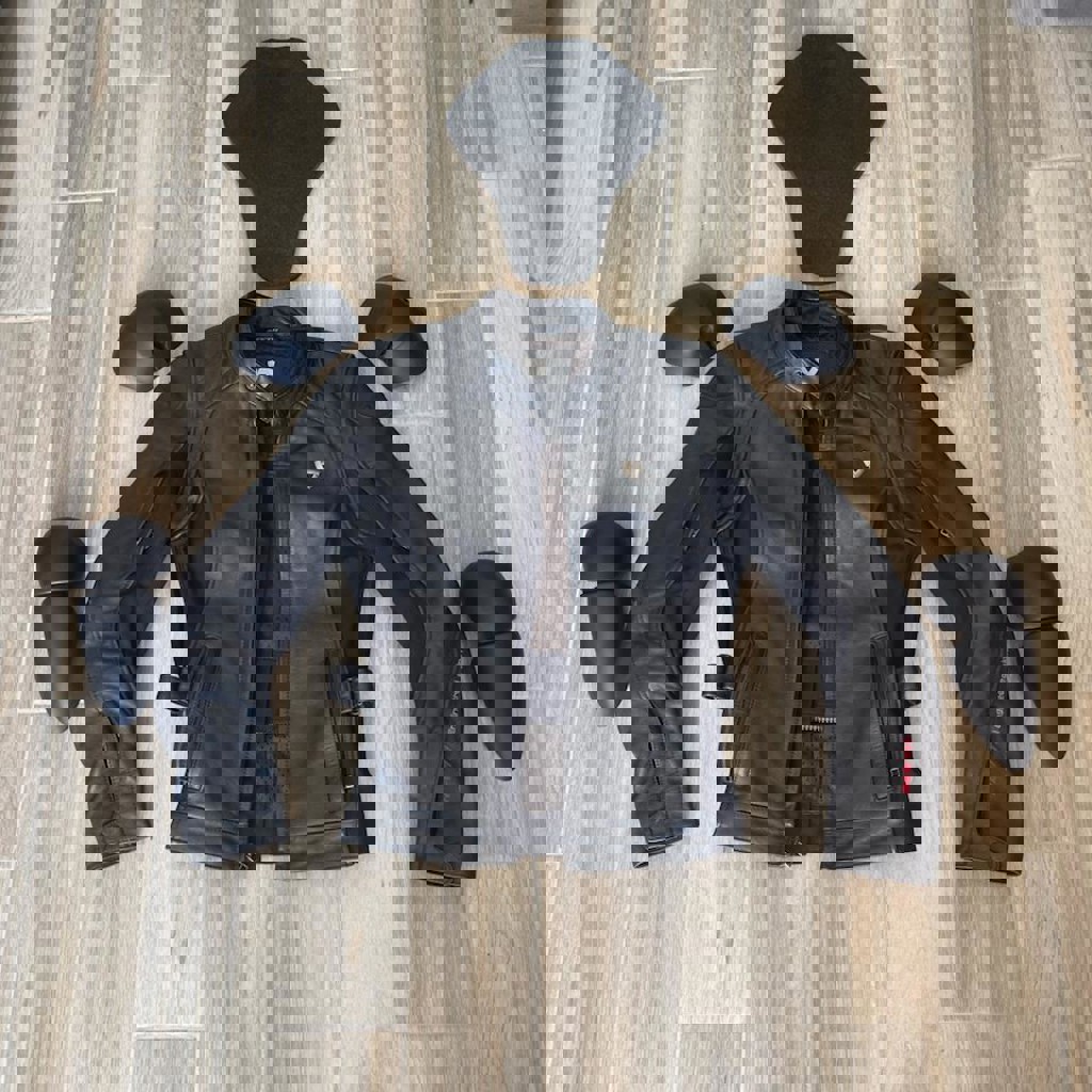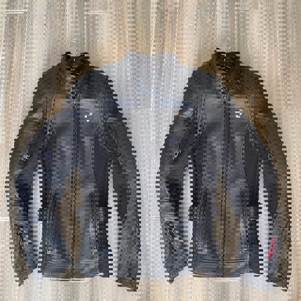 Куртка оснащена всем необходимым для комфортной и безопасной езды: эластичные вставки в области талии с регулируемыми кожаными ремнями на липучках, регулируемая вентиляция в подмышечной зоне, молнии на манжетах, светоотражающая полоса на спине для дополнительной видимости, встроенная защита локтей, плеч и спины. Состояние — близкое к новому, без потертостей и дефектов. Размер: 38.