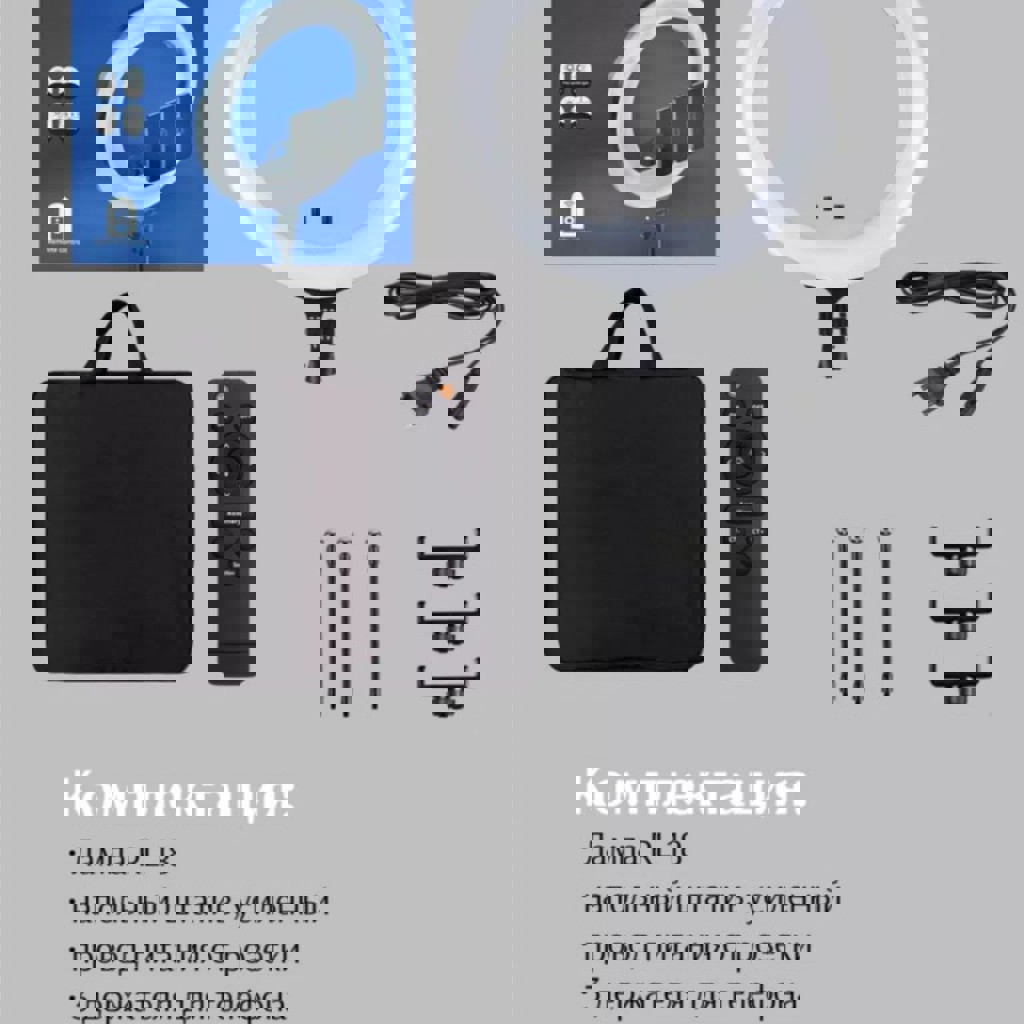 Теплый/холодный свет, плавная регулировка. Пульт, штатив, чехол и все аксессуары с картинки в комплекте.