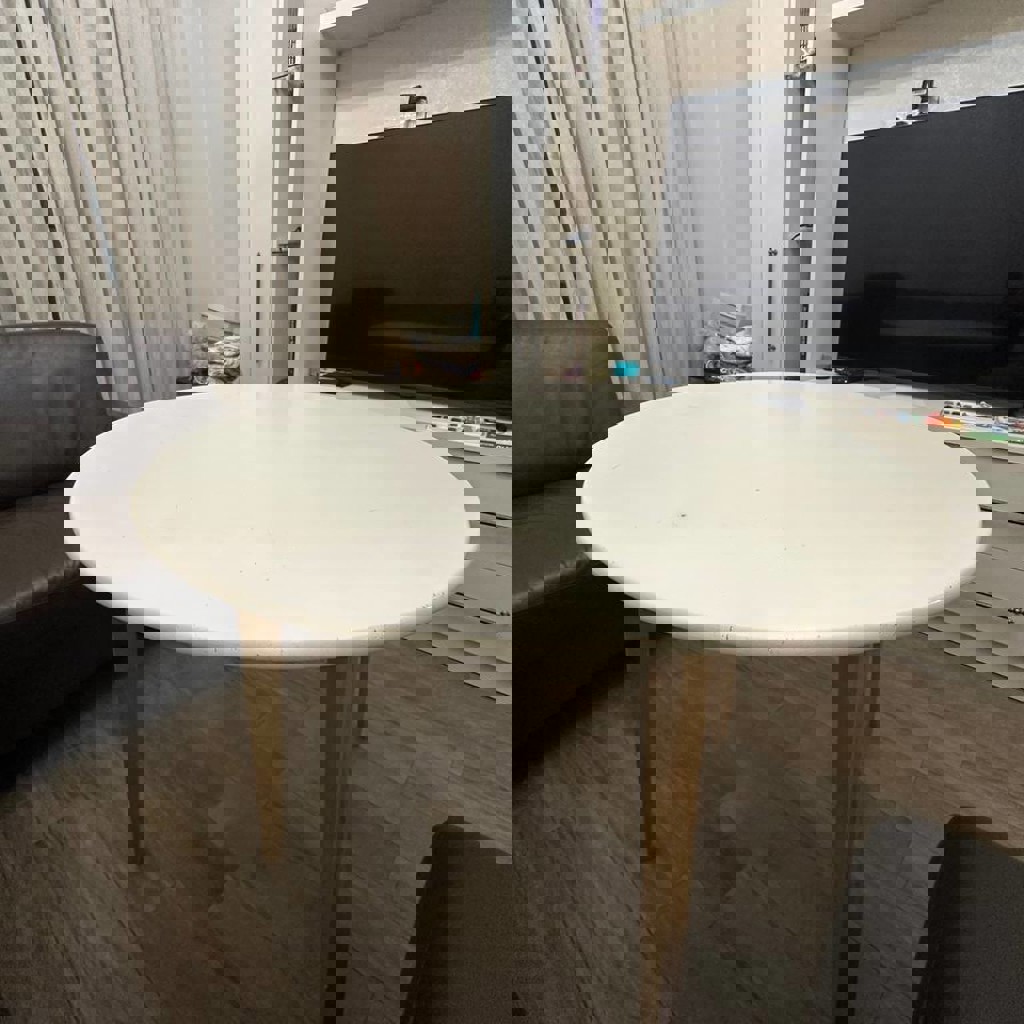 Комплект включает круглый стол с диаметром 102 см и три стула. На столе есть потертости, а на стульях небольшие сколы.